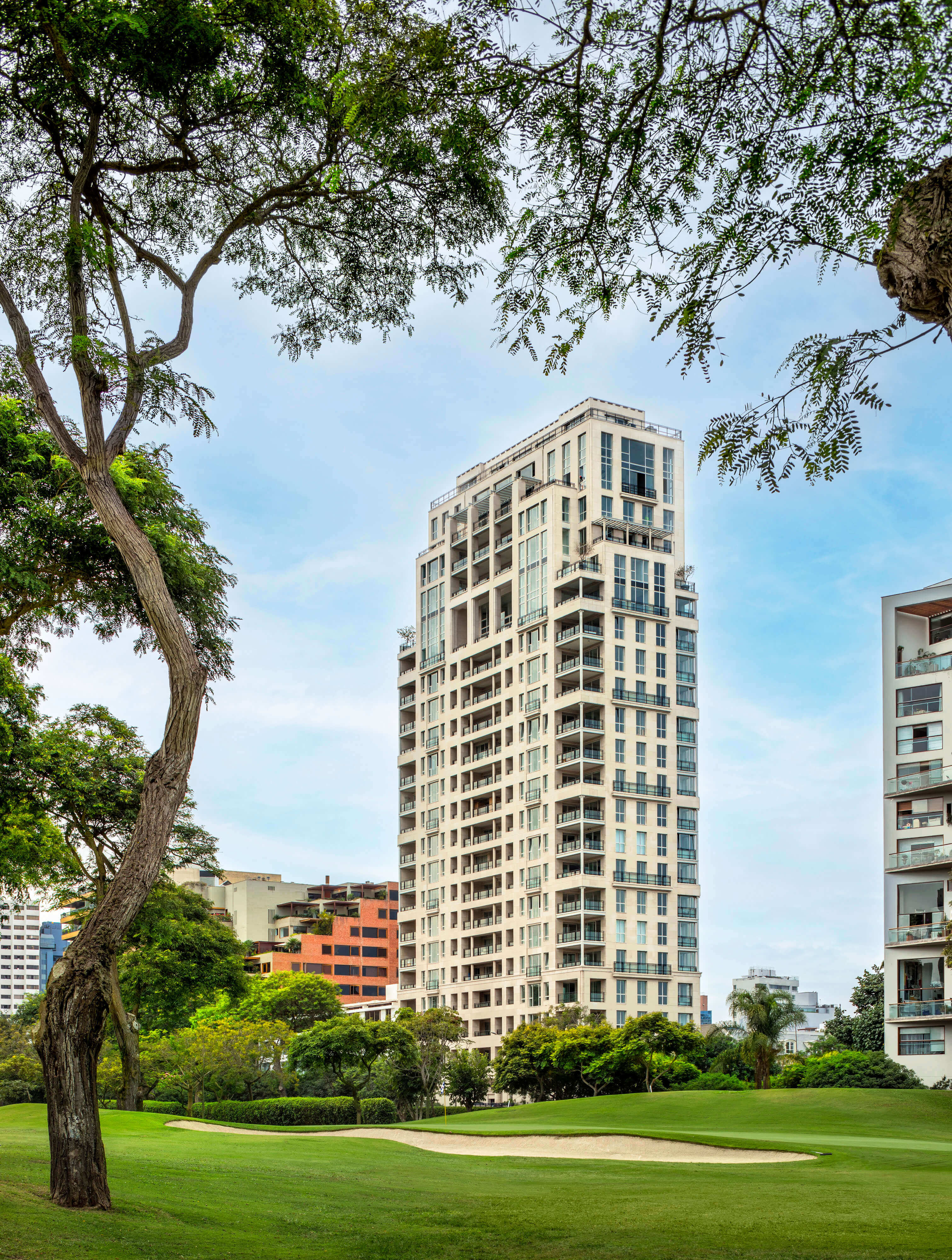 Pezet 375 consists of a tower with 31 apartments and four attached townhouses on a site across from the Golf Club—Lima’s version of New York’s Central Park—in San Isidro, the city’s most desirable residential neighborhood. Facing the Golf Club, living rooms and master bedrooms with large windows open to broad inset loggias at the center of the facade and covered corner terraces to either end. On the other facades, regular groupings of gridded punched windows, articulated with Juliet balconies, trim, and mouldings, create a sense of hierarchy.