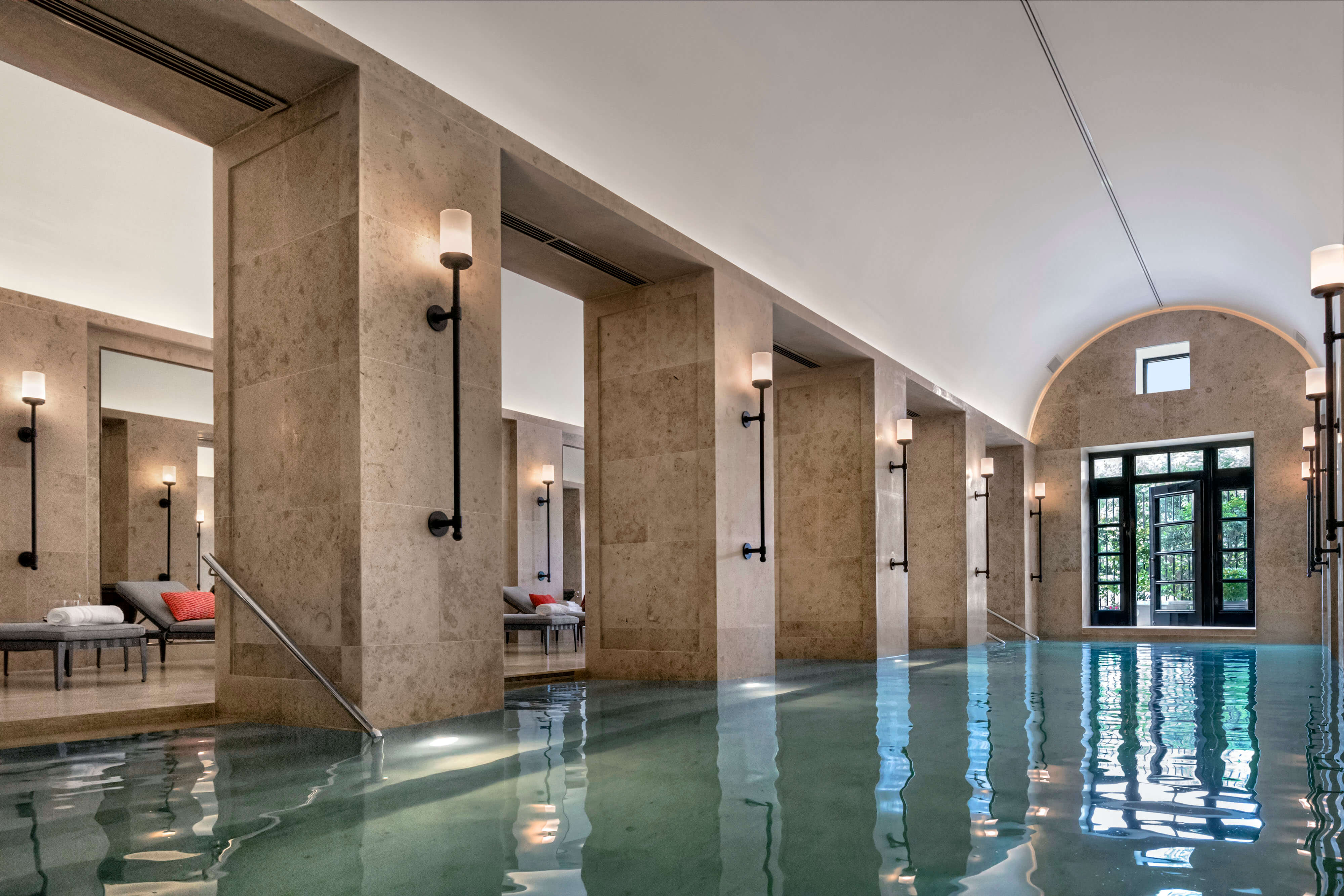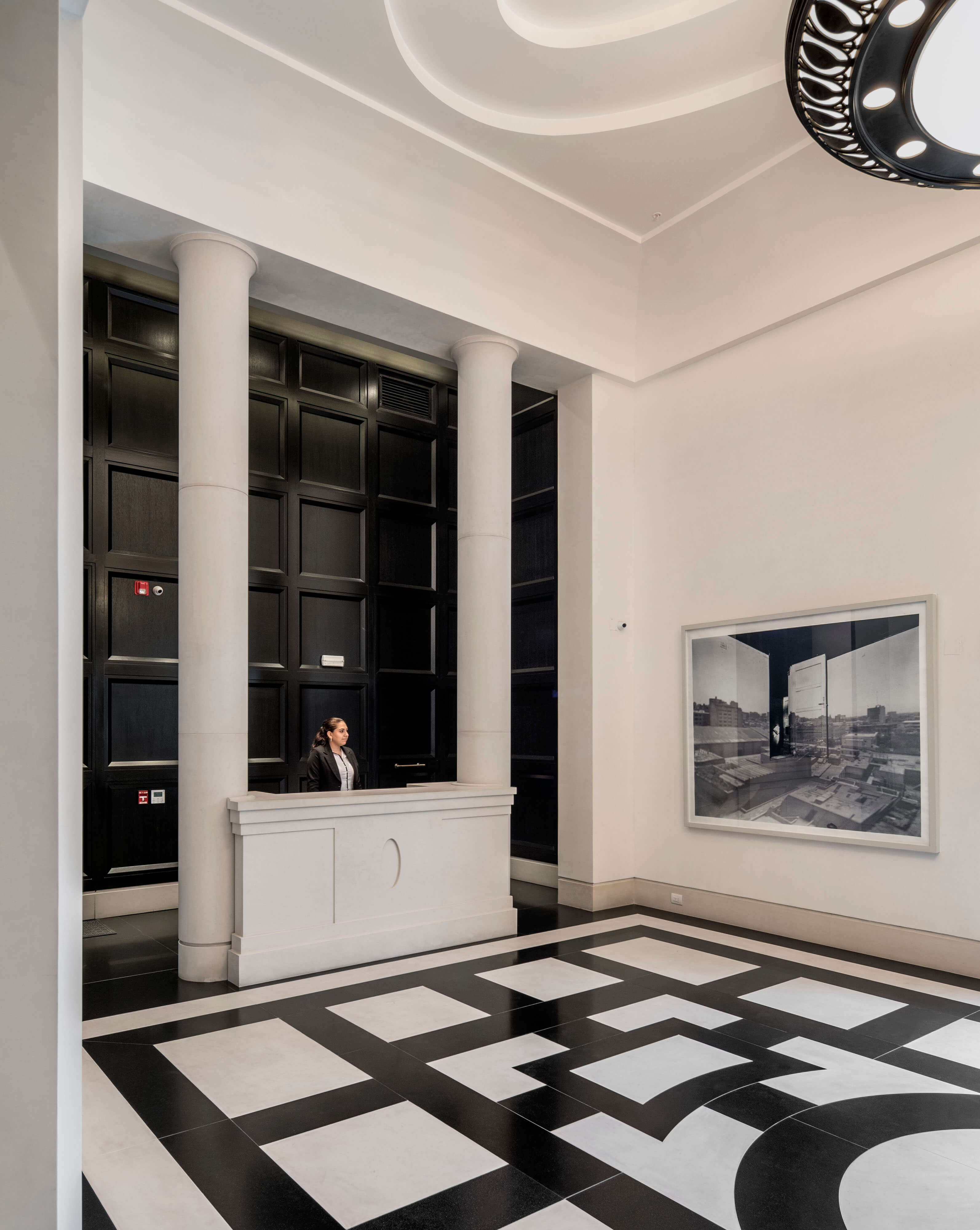 The tower is set back from the street to accommodate a semicircular motor court flanked by two patios. The entrance, carved into the facade and adorned with an updated version of Baroque door surrounds typically found in Lima’s Spanish Colonial heritage, creates a sense of enclosure and security for residents and visitors. The 18-foot-high lobby, with its bold geometric floor pattern, showcases art on simply detailed walls. Resident amenities include an indoor lap pool and lounge, each with barrel-vaulted ceilings; a paneled library; a children’s room; and a fitness center. A dramatic gallery with stucco Venetian walls and a vaulted ceiling leads to a formal garden defined by the four Directoire-style townhouses—each two stories with an attic—that weave our tower into the lower-scale urban fabric of historic San Isidro to the south.