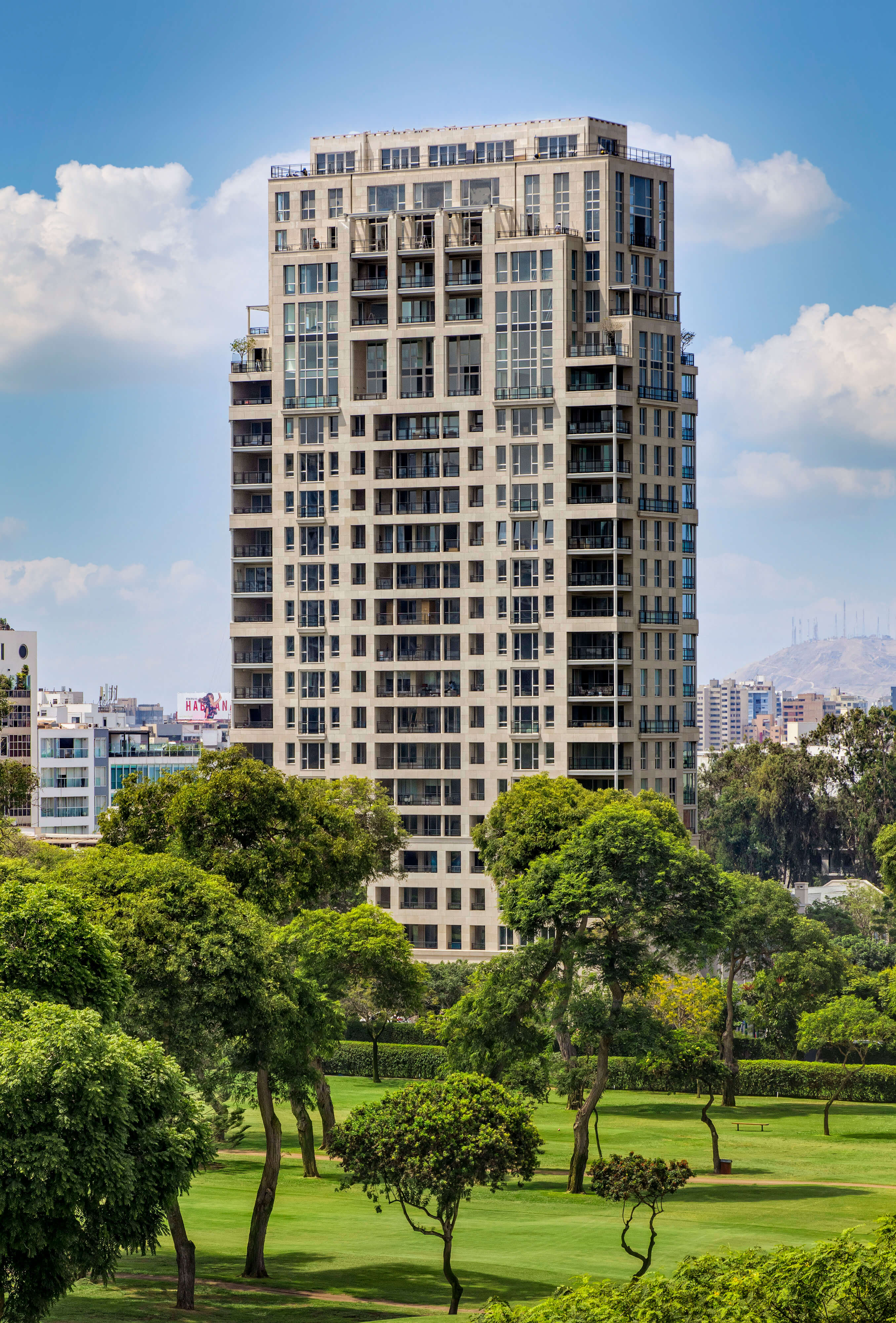 Pezet 375 consists of a tower with 31 apartments and four attached townhouses on a site across from the Golf Club—Lima’s version of New York’s Central Park—in San Isidro, the city’s most desirable residential neighborhood. Facing the Golf Club, living rooms and master bedrooms with large windows open to broad inset loggias at the center of the facade and covered corner terraces to either end. On the other facades, regular groupings of gridded punched windows, articulated with Juliet balconies, trim, and mouldings, create a sense of hierarchy.