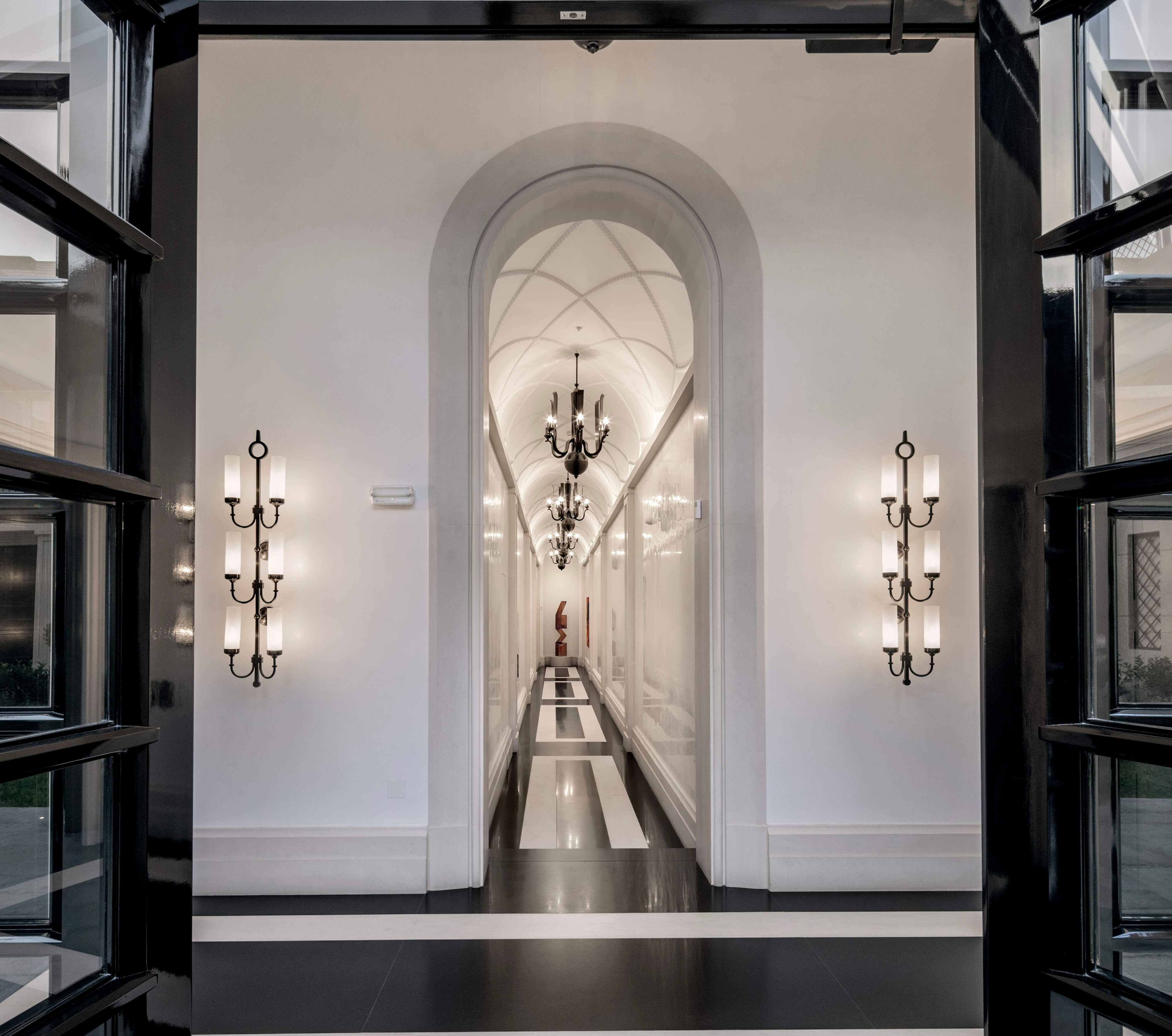 The tower is set back from the street to accommodate a semicircular motor court flanked by two patios. The entrance, carved into the facade and adorned with an updated version of Baroque door surrounds typically found in Lima’s Spanish Colonial heritage, creates a sense of enclosure and security for residents and visitors. The 18-foot-high lobby, with its bold geometric floor pattern, showcases art on simply detailed walls. Resident amenities include an indoor lap pool and lounge, each with barrel-vaulted ceilings; a paneled library; a children’s room; and a fitness center. A dramatic gallery with stucco Venetian walls and a vaulted ceiling leads to a formal garden defined by the four Directoire-style townhouses—each two stories with an attic—that weave our tower into the lower-scale urban fabric of historic San Isidro to the south.