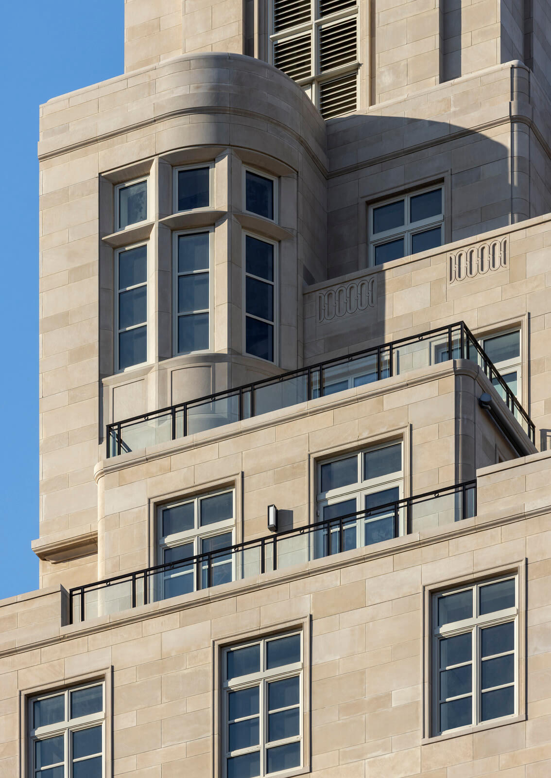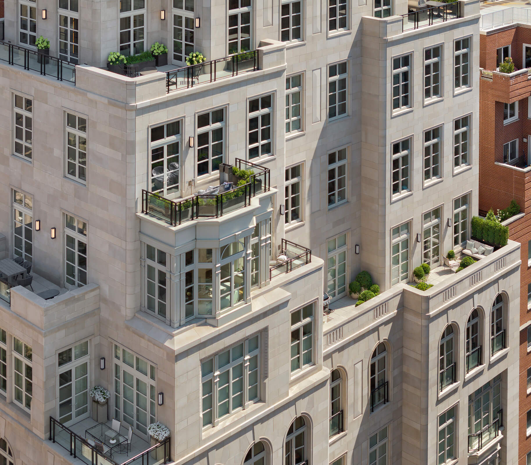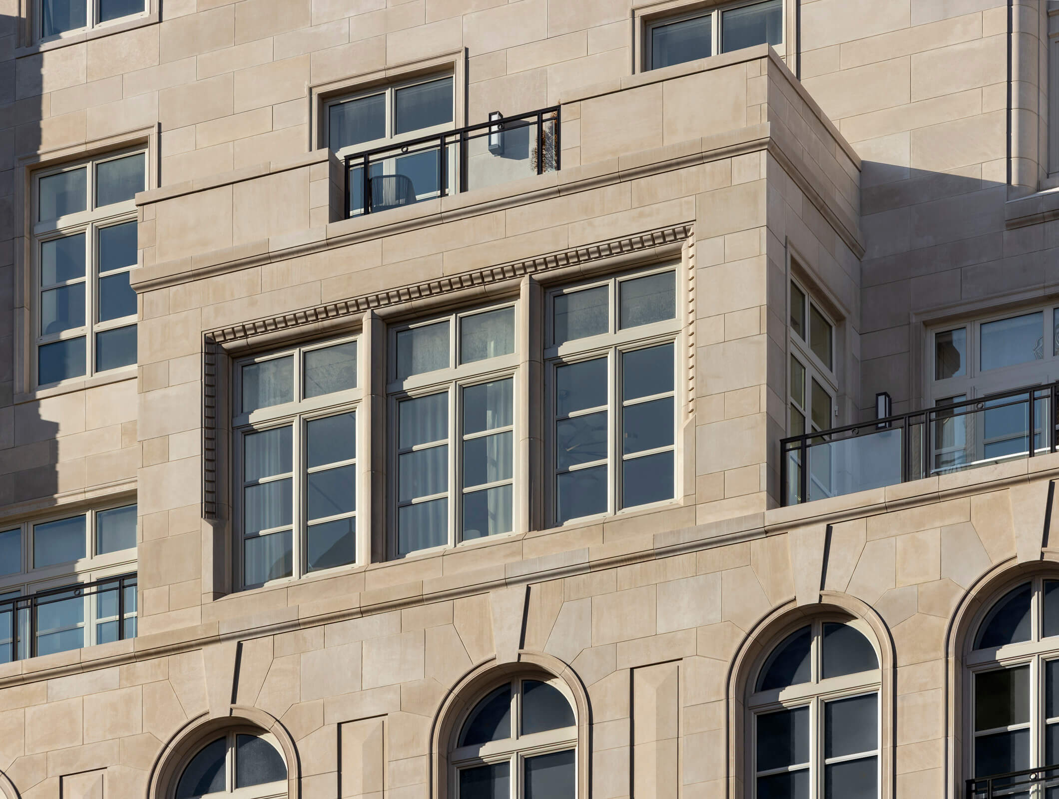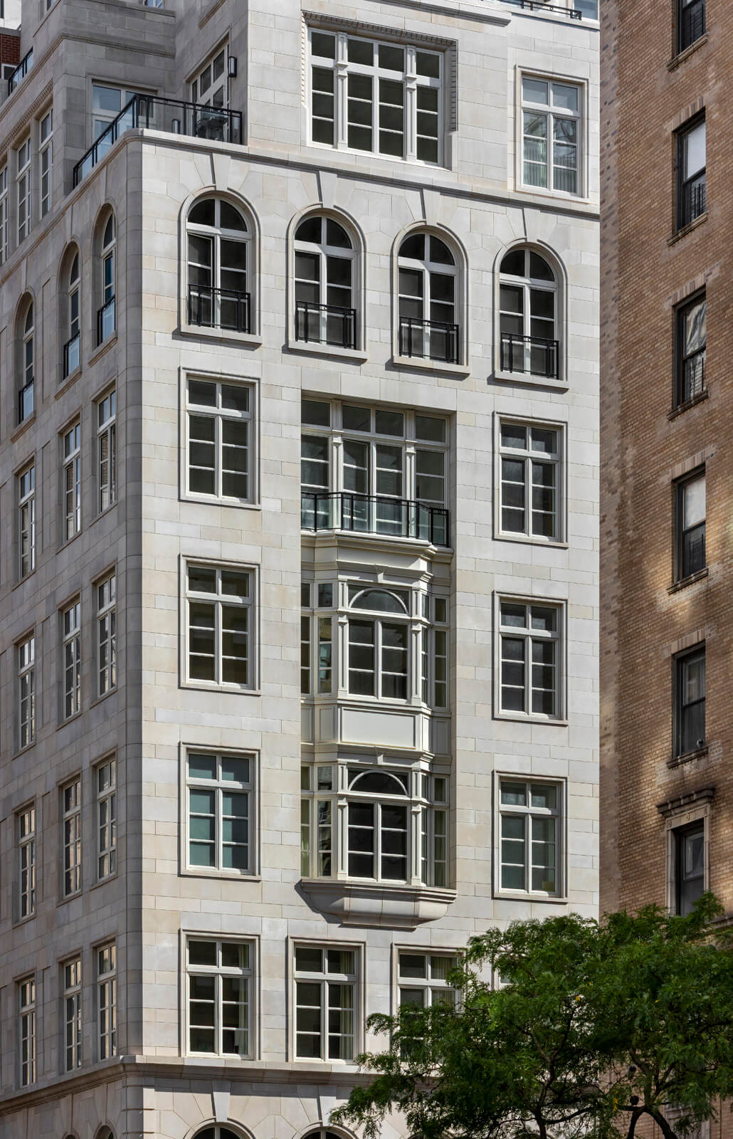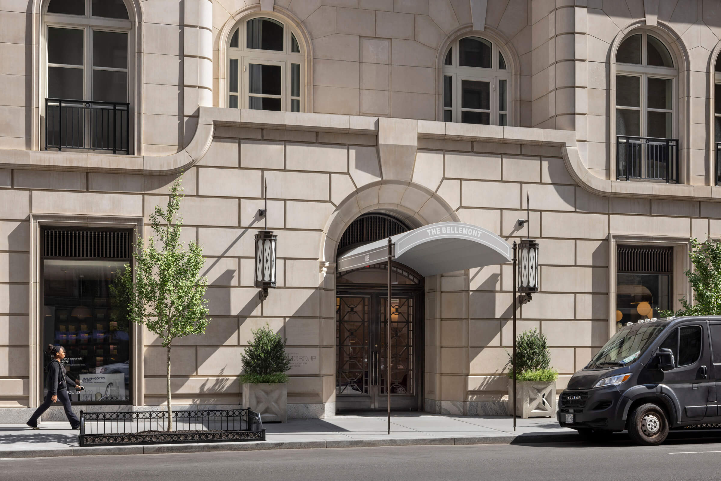 RAMSA‘s design for the Bellemont encapsulates the dimensional and stylistically eclectic qualities of Madison Avenue and is inspired primarily by the grand mansions built along 5th Avenue and Madison Avenue in the late 19th and early 20th centuries. This bolder American interpretation of traditional French architecture is evident in the Bellemont’s strong rustication, curved corners, and dramatic sculptural expression. Traditional palazzos of the same era inform some of the building’s detailing, such as rustication at the base with simpler stone patterning above, and traces of the Queen Anne architectural style appear in the strapwork, bay windows, and carved stonework around the windows. Classical French elements are apparent in the carefully planned voussoirs around the arch of the main front door and a series of arched windows that clearly mark the piano nobile as well as the frieze floor on the seventh level. Above the seventh floor, multiple penthouses on setbacks form the top half of the building. An iconic crown includes cornices, brackets, circular openings, and voussoirs characteristic of historic French architecture.