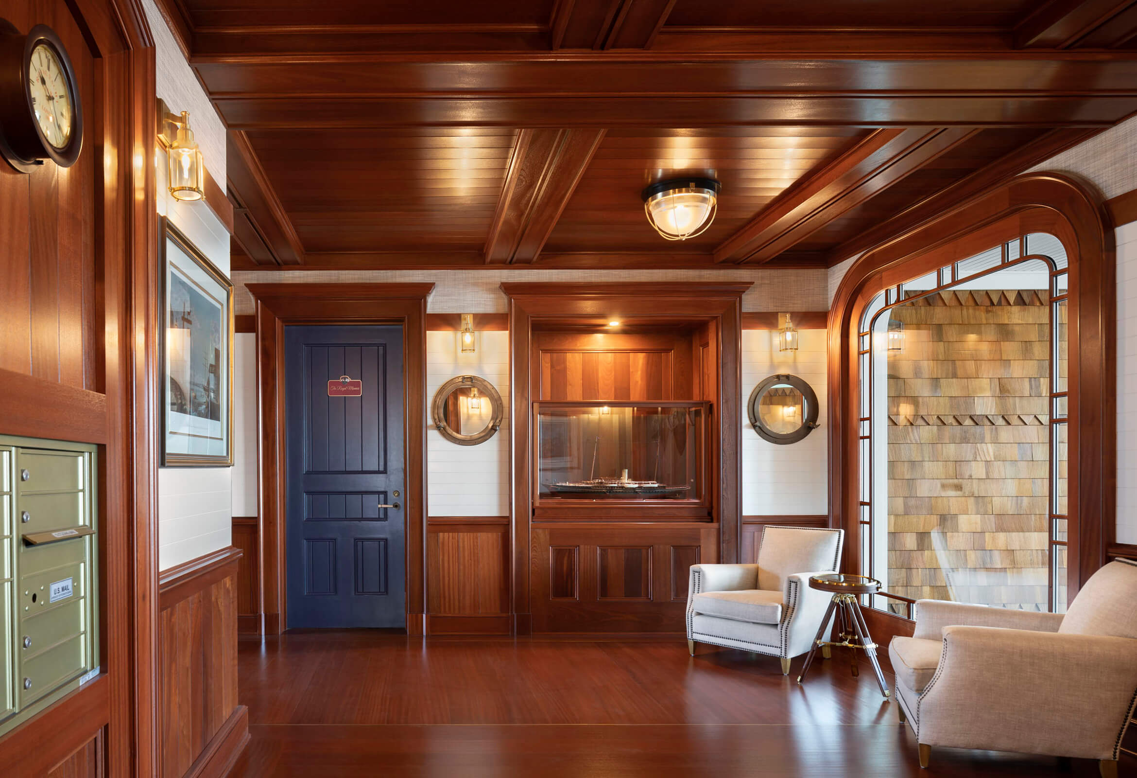 Located on the southern tip of a peninsula just east of Greenwich Harbor, this 14,000-square-foot apartment house offers eight condominium residences ranging from 800-square-foot one-bedroom units to 2,000-square-foot three-bedroom apartments, all with porches sized for dining and entertaining and private underground parking. Sited to favor views to the harbor to the west and Smith Cove to the east, the building is conceived as a large house or inn in the New England Shingle-style tradition, expressed in fieldstone and cedar shakes. Landscaped terraces descend to a waterside promenade.