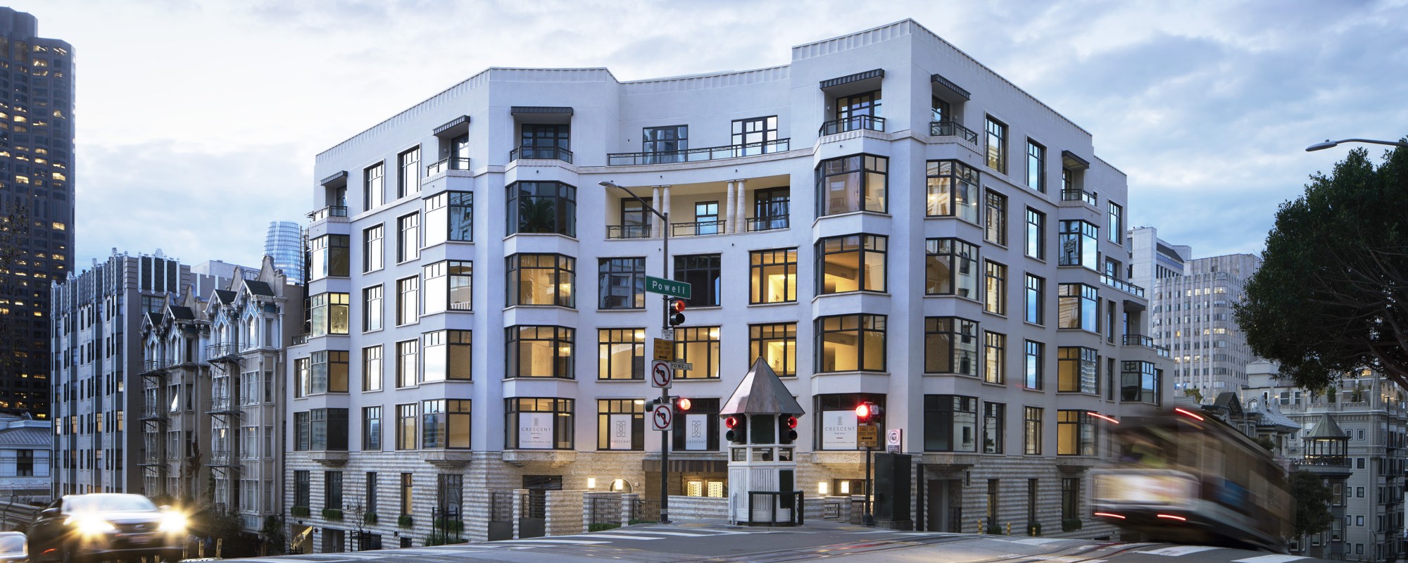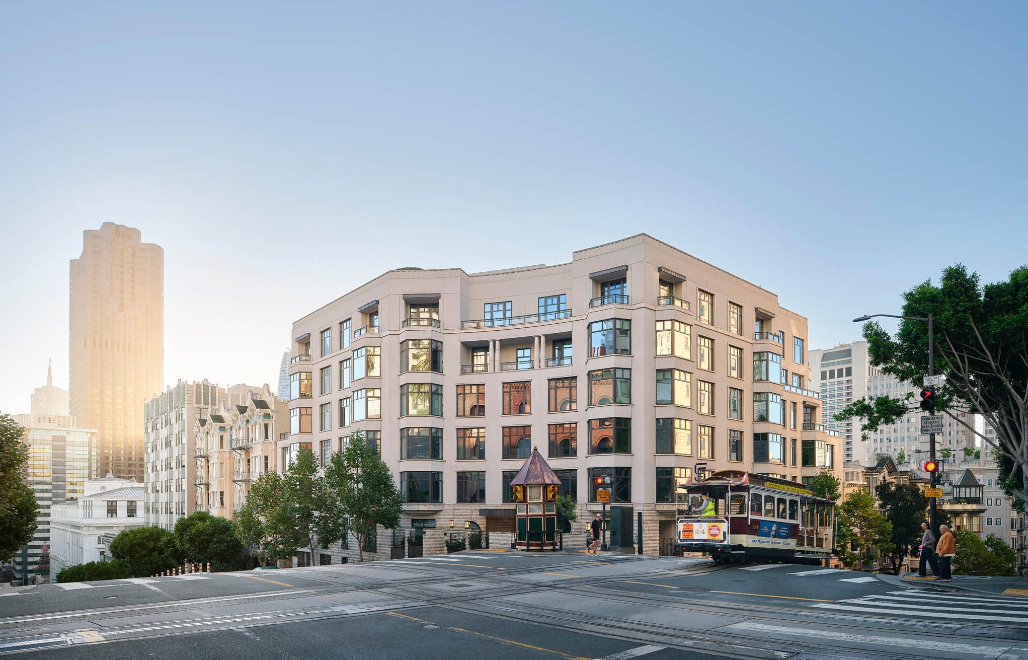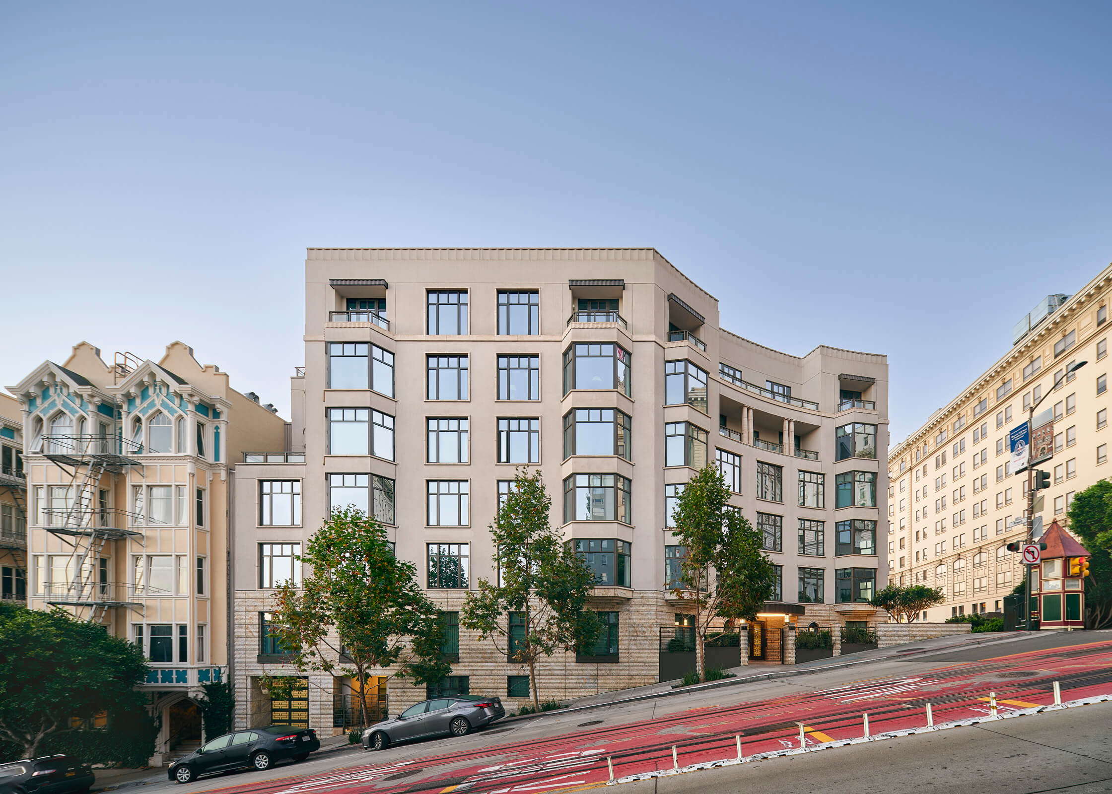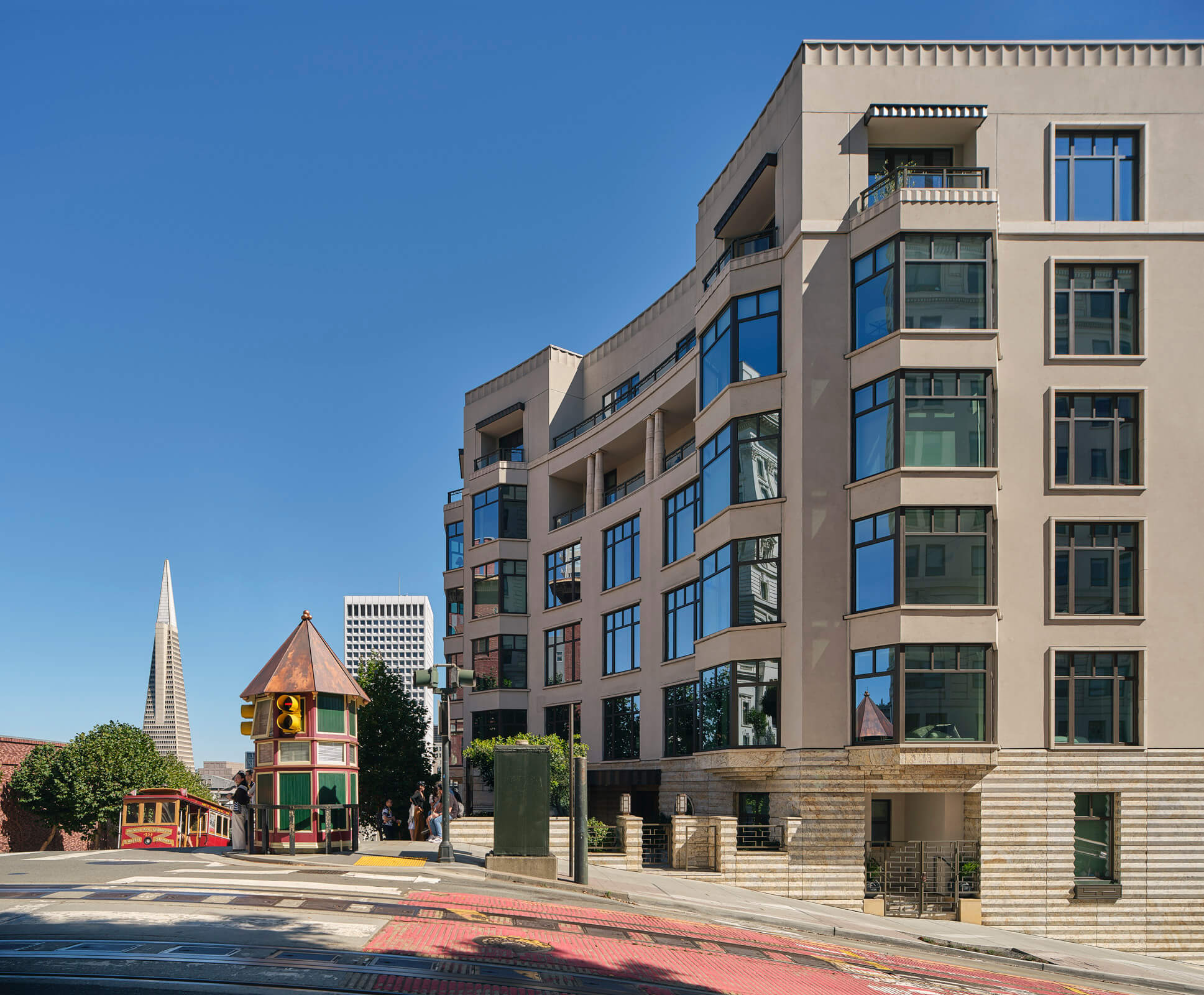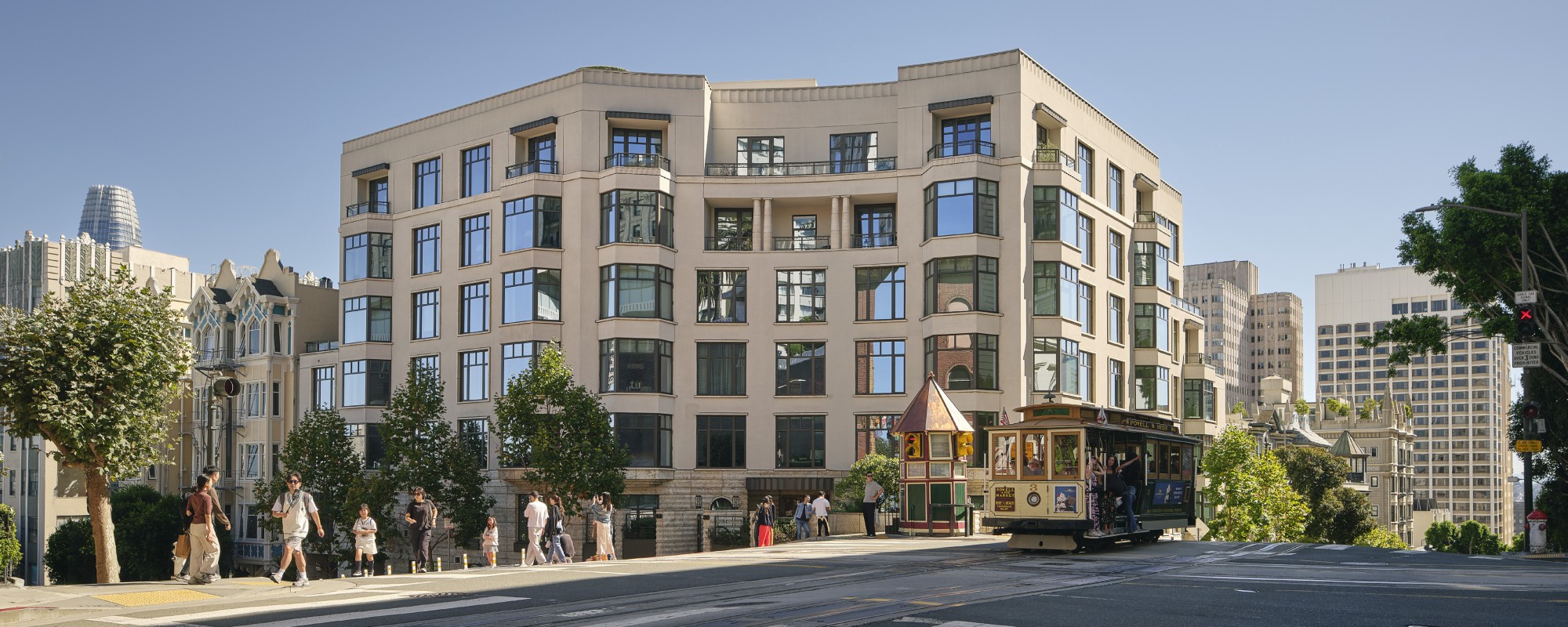 875 California Street will stand atop San Francisco's Nob Hill at the intersection of Powell and California Streets—a storybook location at the crossing of the city's two historic cable car lines. The 7-story, 44-unit, 100,000-square-foot residential building steps back from the corner with a bold curving facade that cradles a landscaped entry garden, creating an intimate, welcoming approach for residents and their guests that is also a visual amenity for the neighborhood. To either side, the building holds the street wall above a horizontally striated granite base, stepping down the slope along both Powell and California Streets to meet adjacent buildings. The facades present a contemporary interpretation of the San Francisco tradition of tall bay windows that capture views up and down the streets.