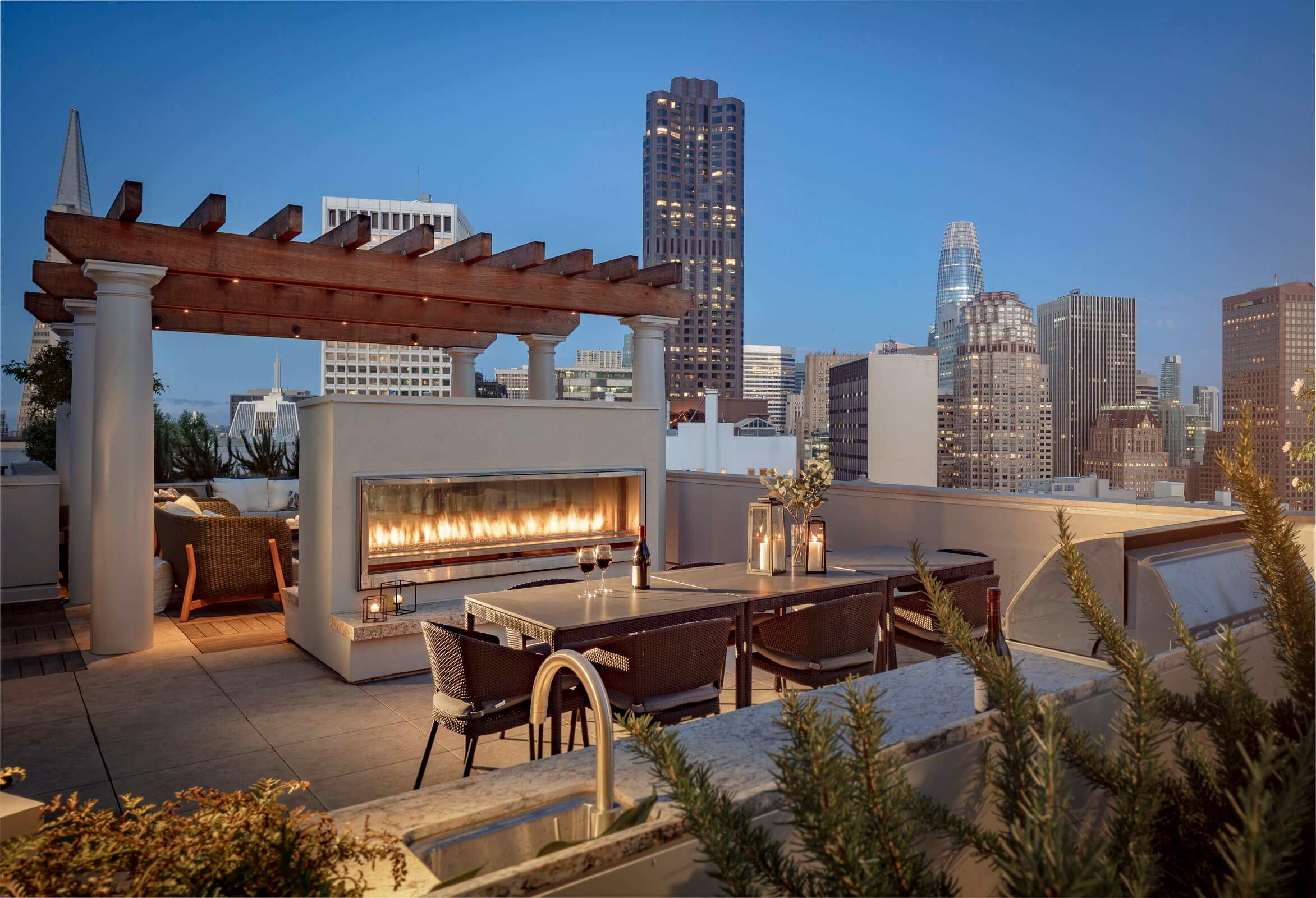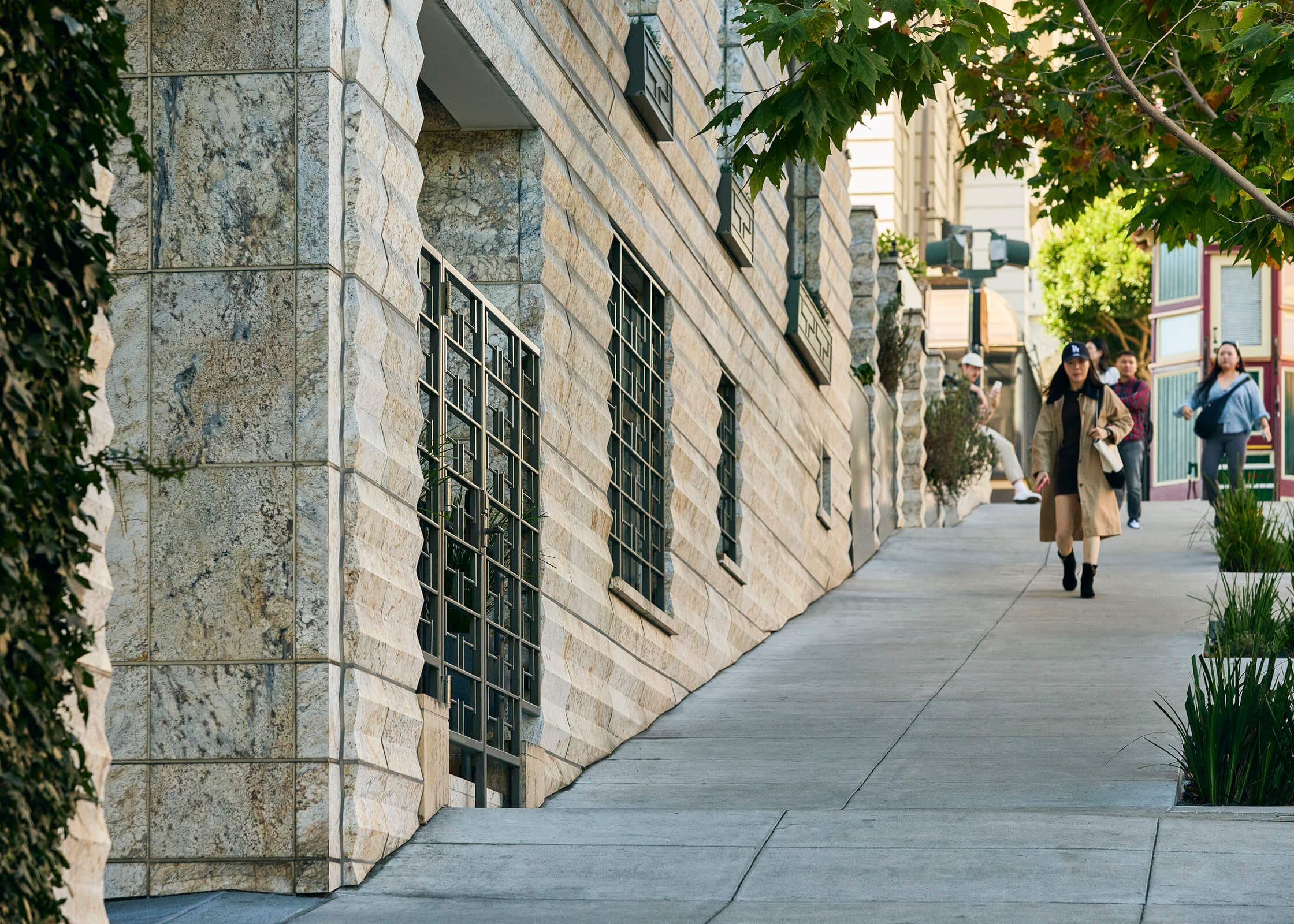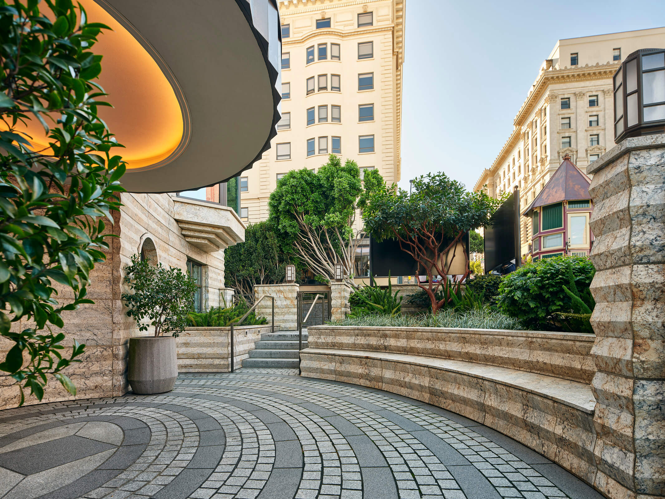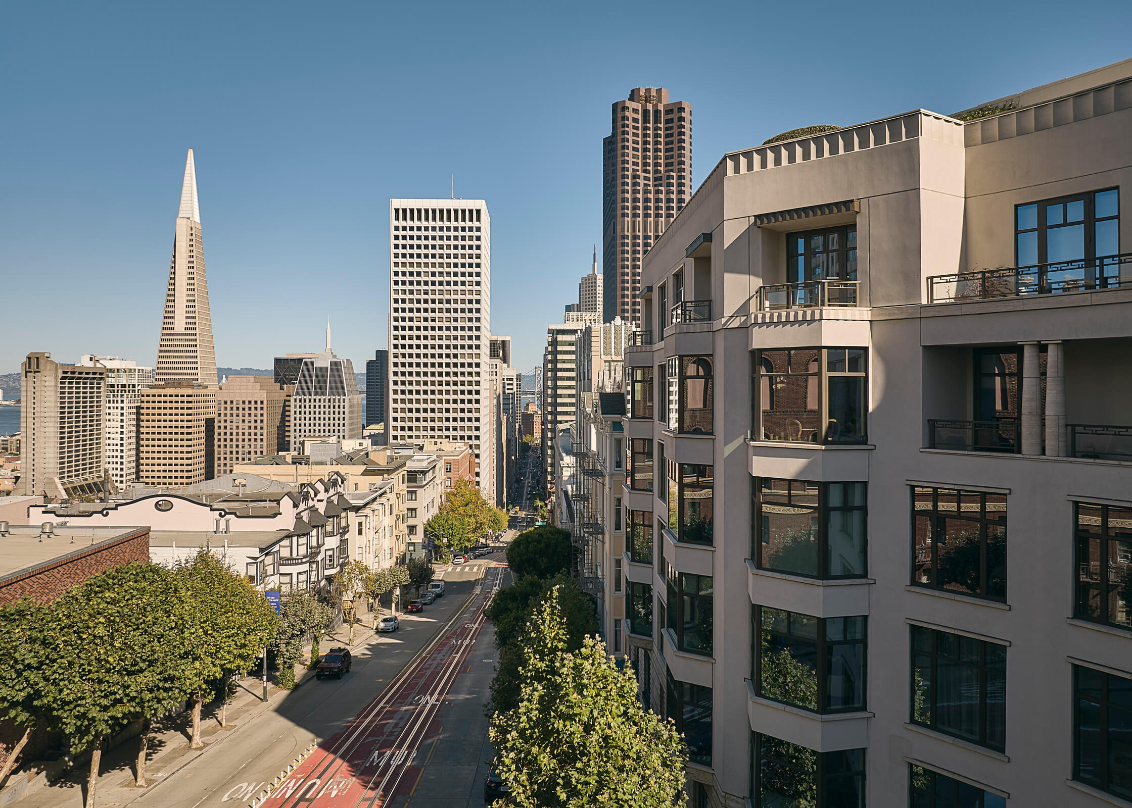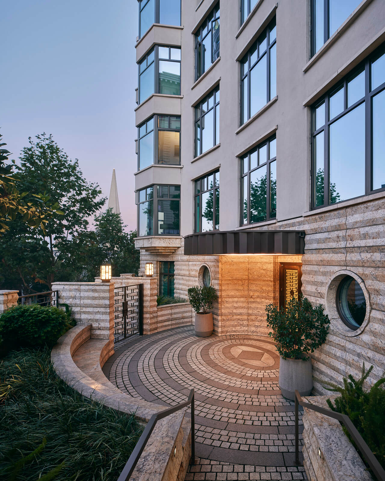 875 California Street will stand atop San Francisco's Nob Hill at the intersection of Powell and California Streets—a storybook location at the crossing of the city's two historic cable car lines. The 7-story, 44-unit, 100,000-square-foot residential building steps back from the corner with a bold curving facade that cradles a landscaped entry garden, creating an intimate, welcoming approach for residents and their guests that is also a visual amenity for the neighborhood. To either side, the building holds the street wall above a horizontally striated granite base, stepping down the slope along both Powell and California Streets to meet adjacent buildings. The facades present a contemporary interpretation of the San Francisco tradition of tall bay windows that capture views up and down the streets.