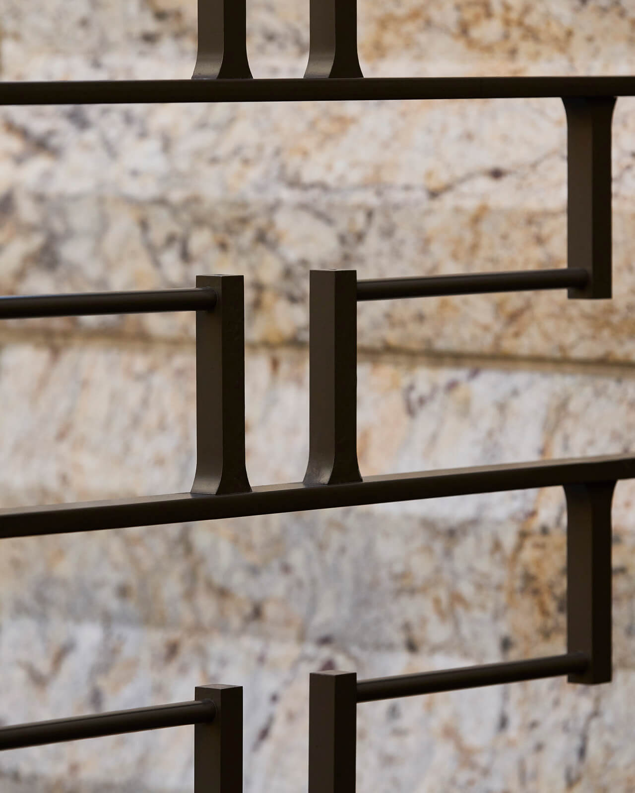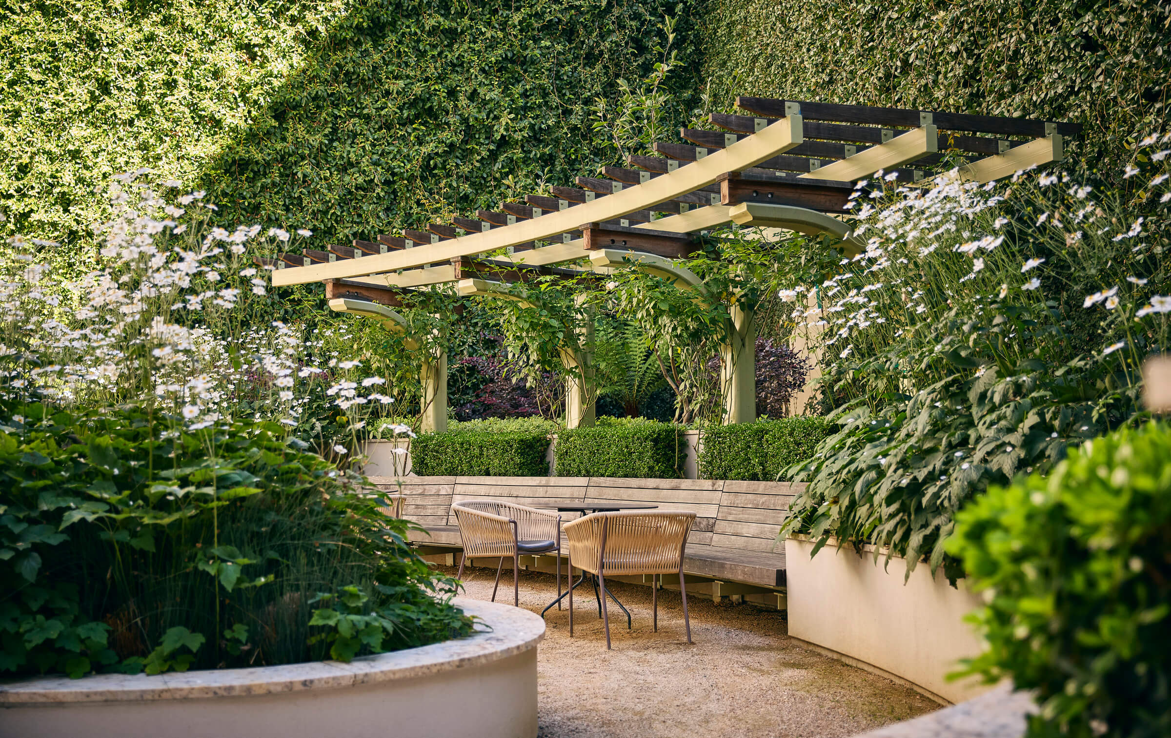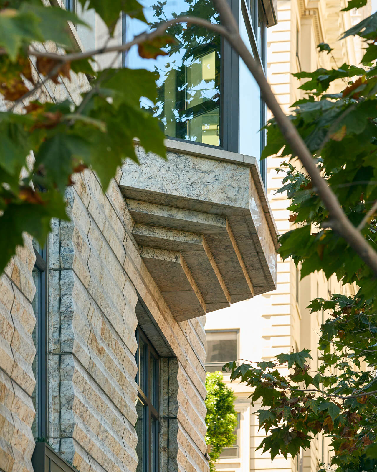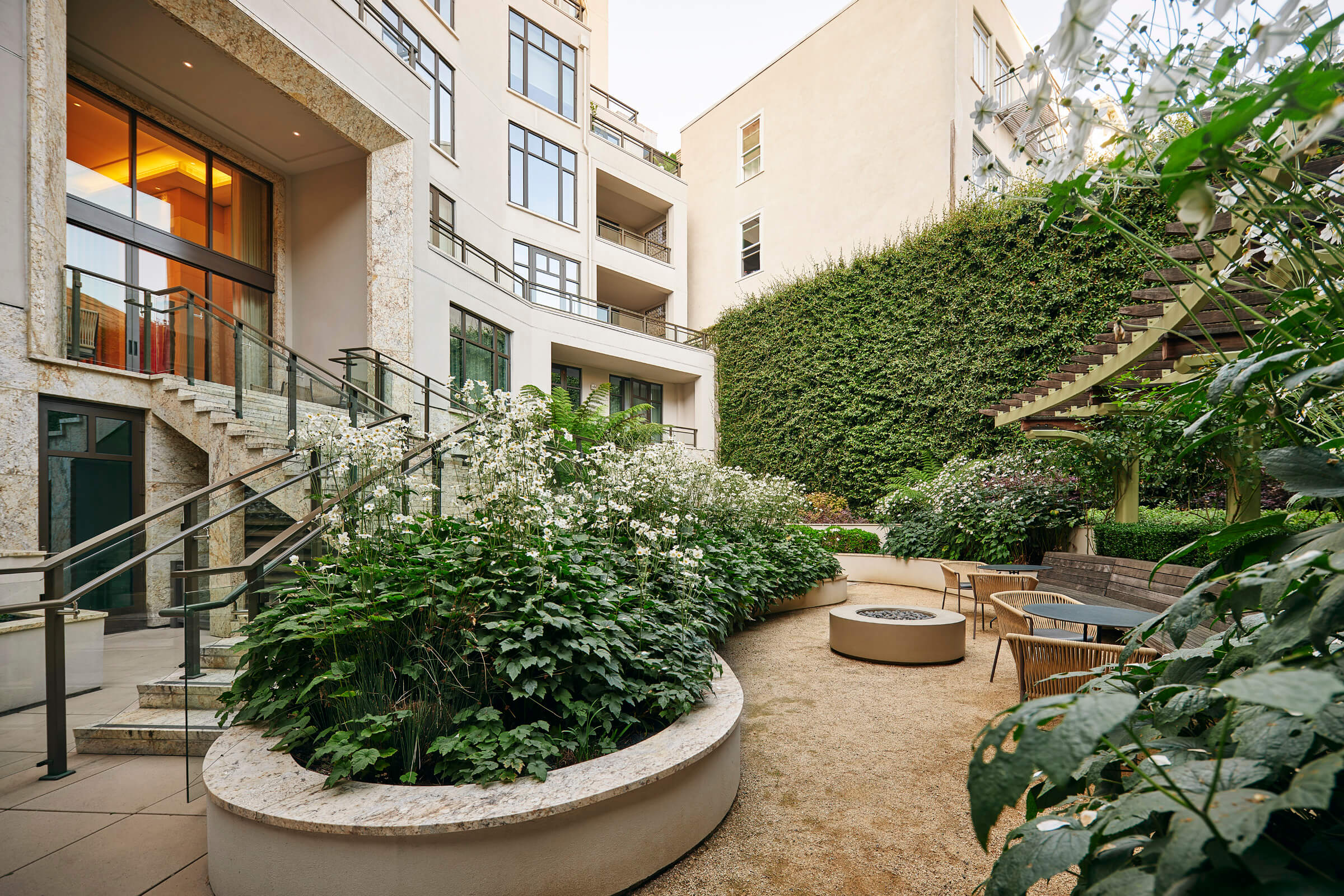 Inside, stairs from the marble and Venetian plaster lobby descend to a double-height trellised and mirrored conservatory that opens out to a private residents' garden at the rear. Rooftop gardens and private terraces toward the top of the building, and a set-back penthouse with a fluted cornice and cantilevered canopies at the crown, complete the composition.