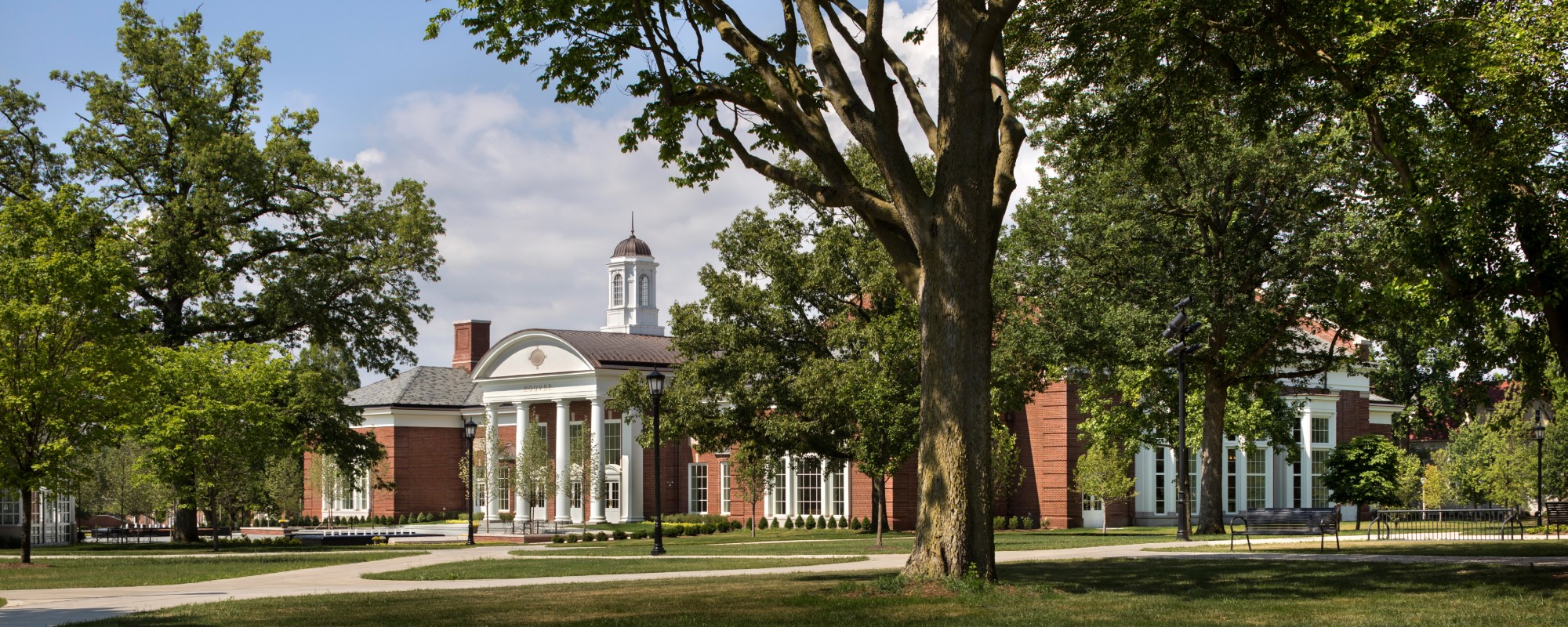 Replacing an inadequate dining hall that blocked the view from Bowman Park to DePauw's landmark 1883 East College building, Hoover Hall together with our Hubbard Center for Student Engagement, now under construction, bounds a new landscaped mall that frames the view from Hanna Street to East College. Locating the kitchen and other service spaces below grade enabled us to design Hoover Hall as a freestanding building with four fronts. Sectional doors on Hanna Street conceal the loading dock. Both Hoover Hall and the Hubbard Center carry forward the Georgian character of older campus buildings, expressed in waterstruck red brick, Indiana limestone, and painted wood trim.