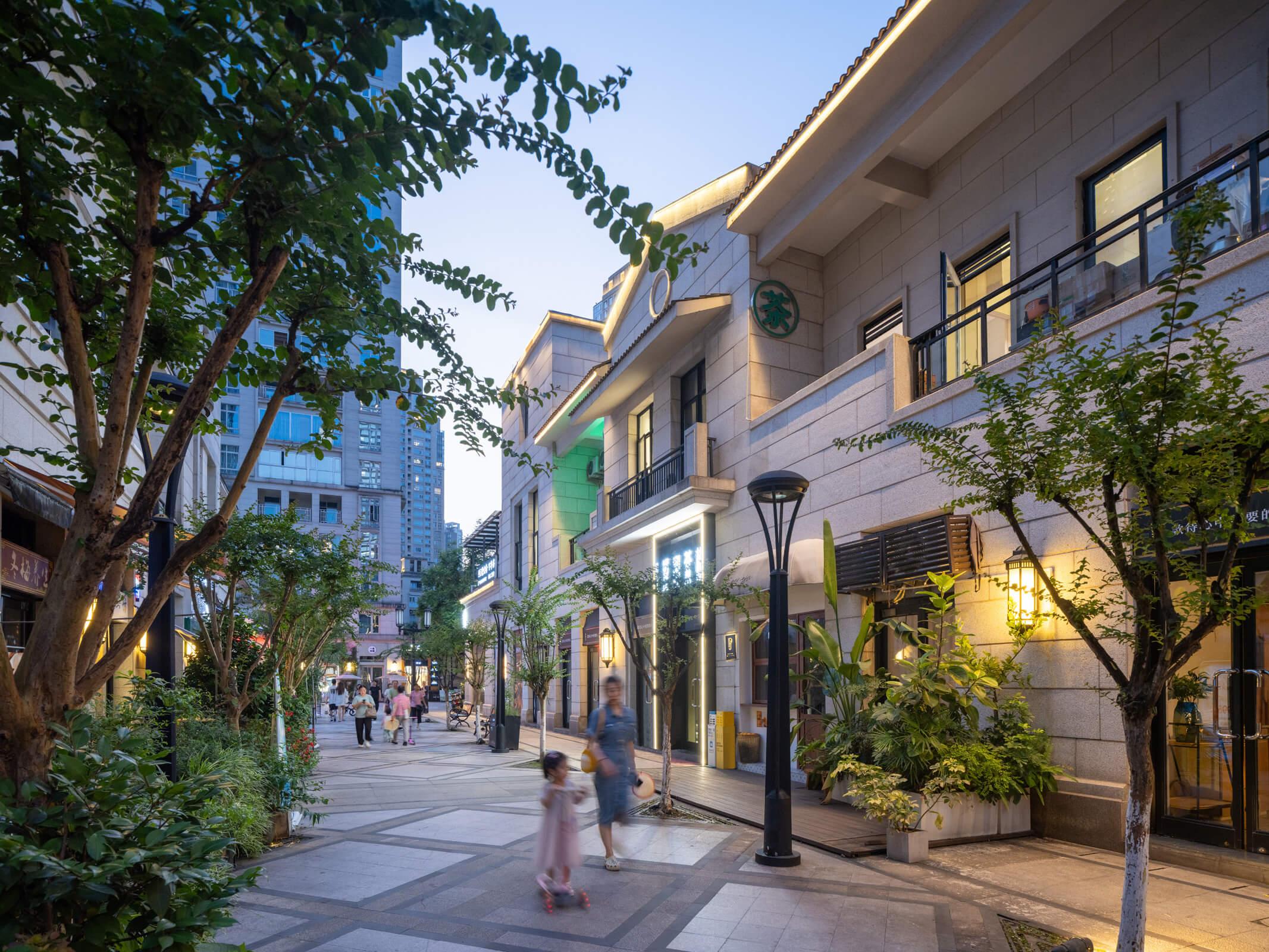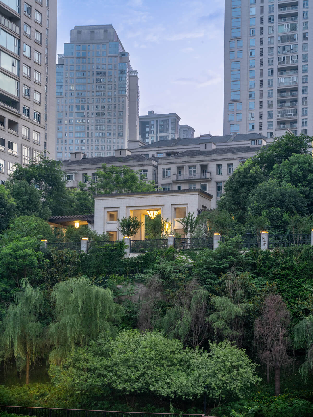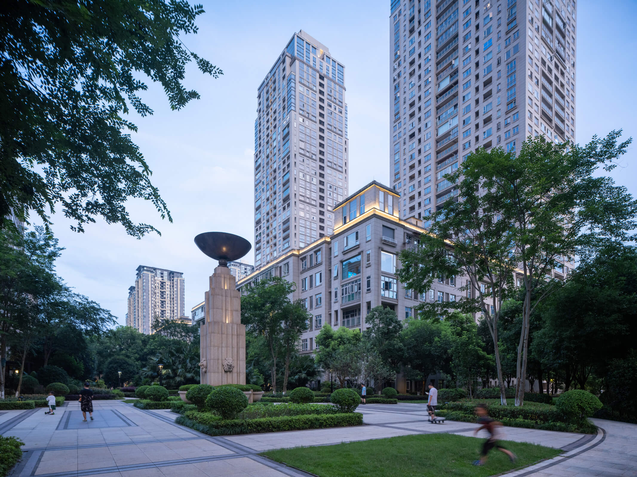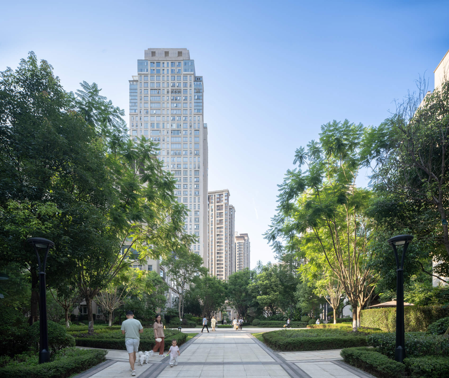 The development’s architectural expression reintroduces to Chongqing a distinctive cosmopolitan approach—masonry facades with granite at the base, large windows, deep terraces—that combines local and Western traditions. The crowns of the towers restate the scale of the street, unifying and reducing the apparent scale of the whole.