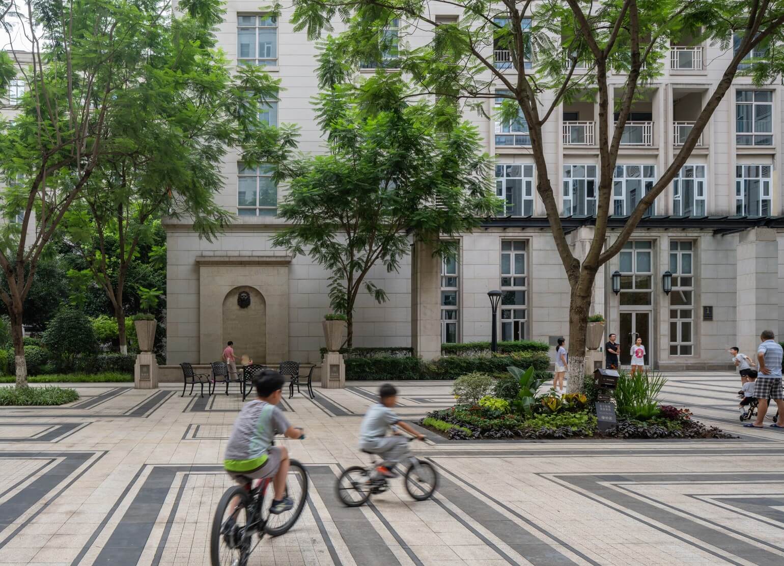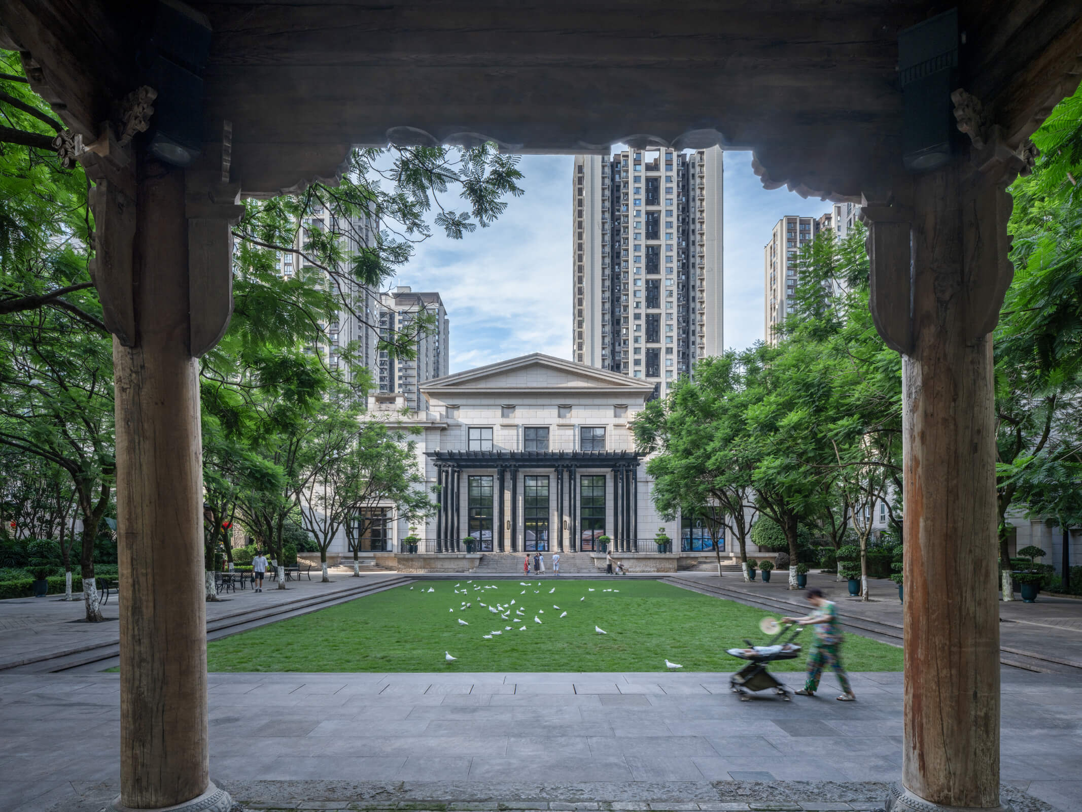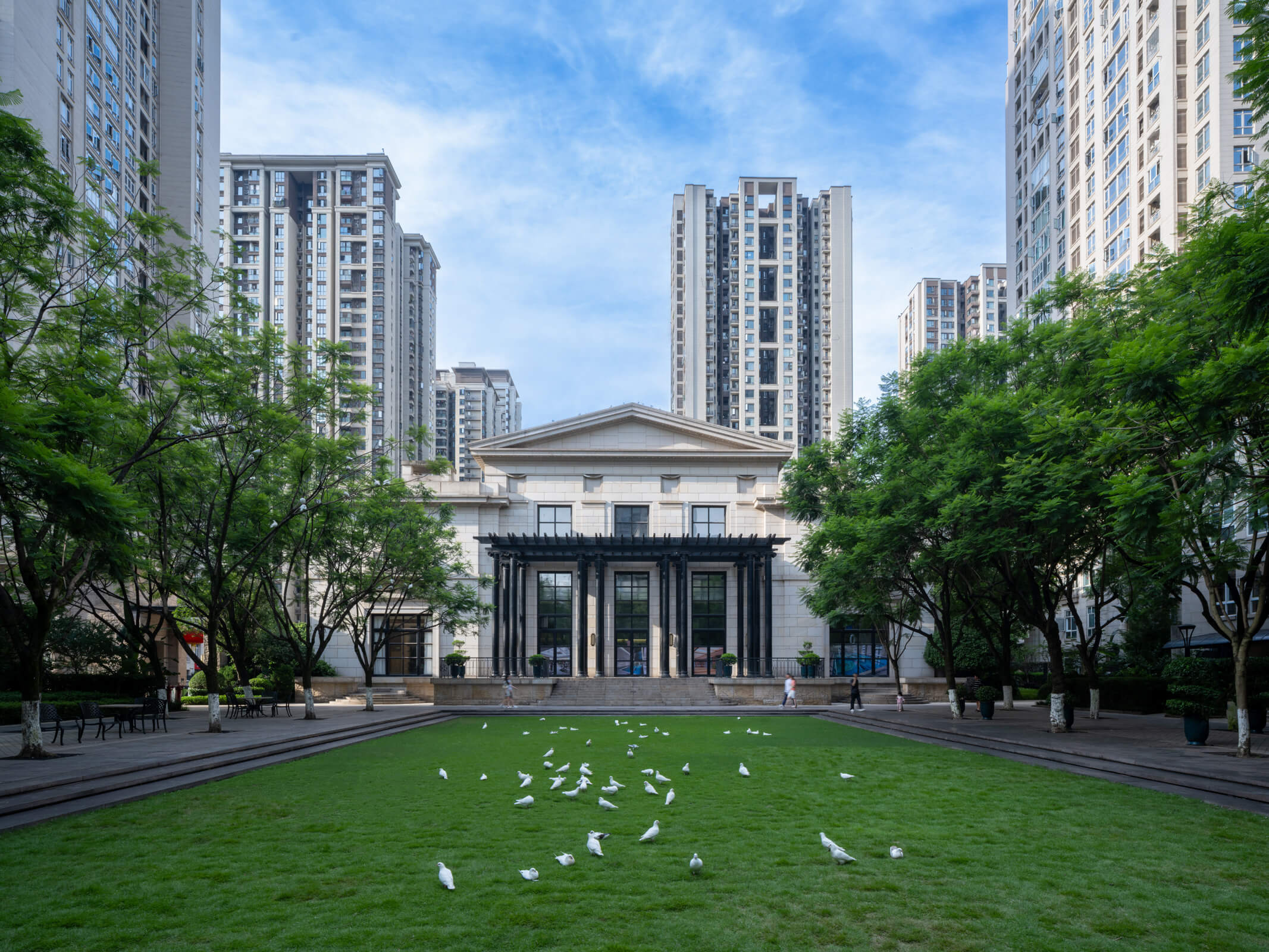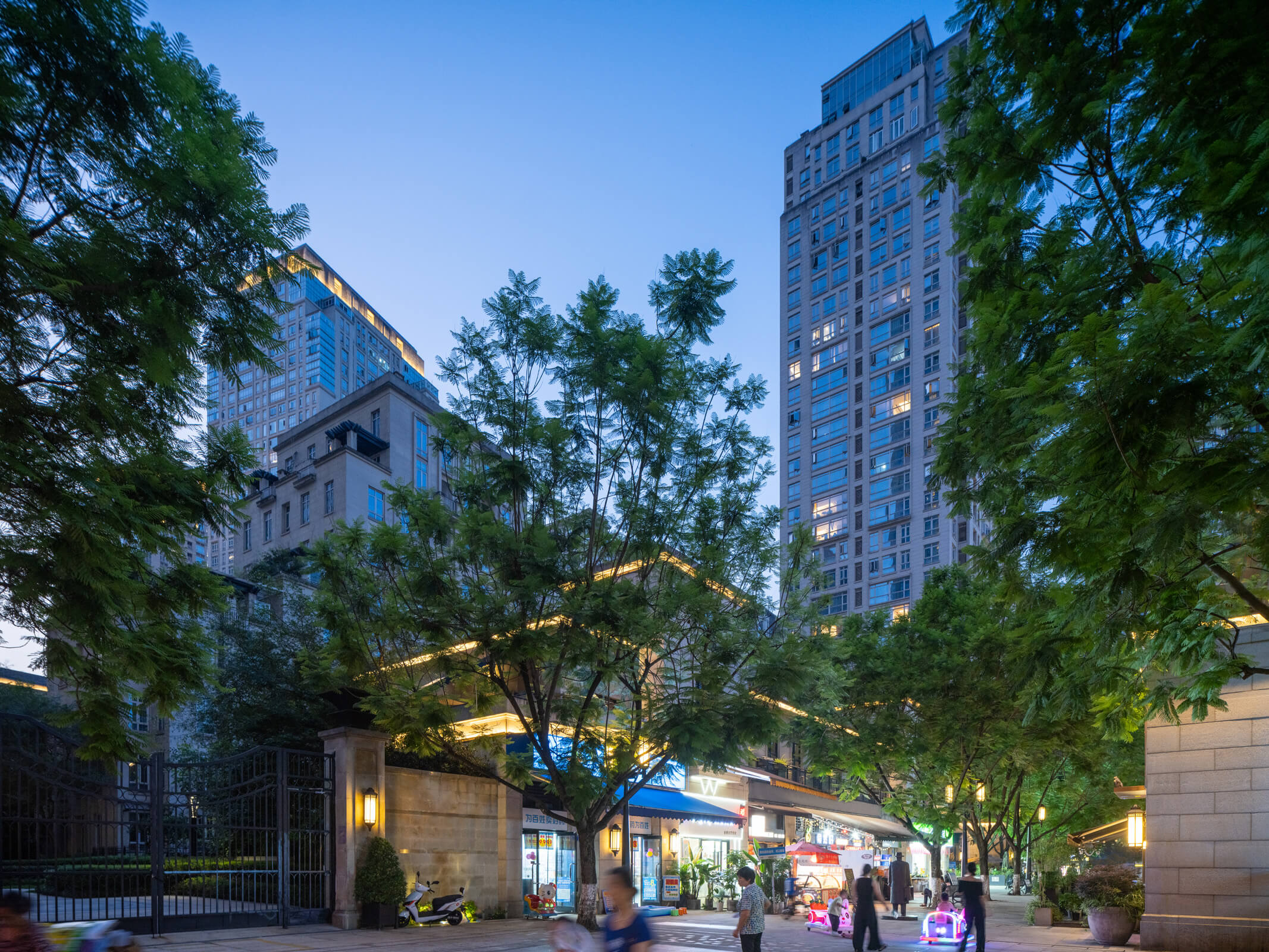 The development’s architectural expression reintroduces to Chongqing a distinctive cosmopolitan approach—masonry facades with granite at the base, large windows, deep terraces—that combines local and Western traditions. The crowns of the towers restate the scale of the street, unifying and reducing the apparent scale of the whole.