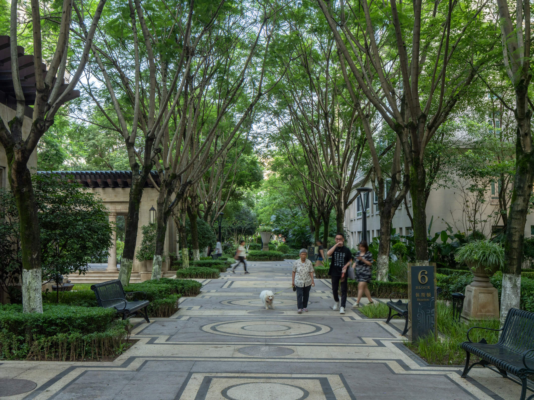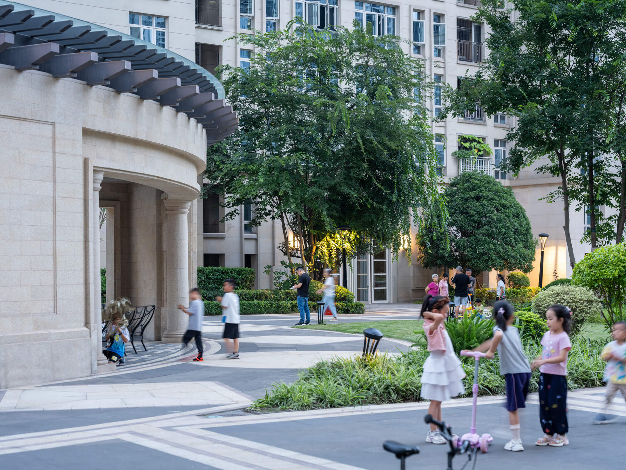 Because the site is bordered on three sides by unattractive urban infrastructure, a curved grid, with a hierarchy of curvilinear streets, spans the site from north to south. Shared outdoor spaces encourage community and provide internal views away from the busier streets and rail lines that surround it, creating a comfortable, residential neighborhood within a larger dense urban amalgam. Mid-rise buildings define the major east-west view corridor and mediate between the scale of the towers and the low retail buildings. The two primary neighborhoods are identified by the tallest towers, which provide open views to the city and the Yangtze River. Continuous public greenery and terraced gardens lead from a kindergarten, located on the western edge of the site, through six residential blocks stepping down toward the southeast.