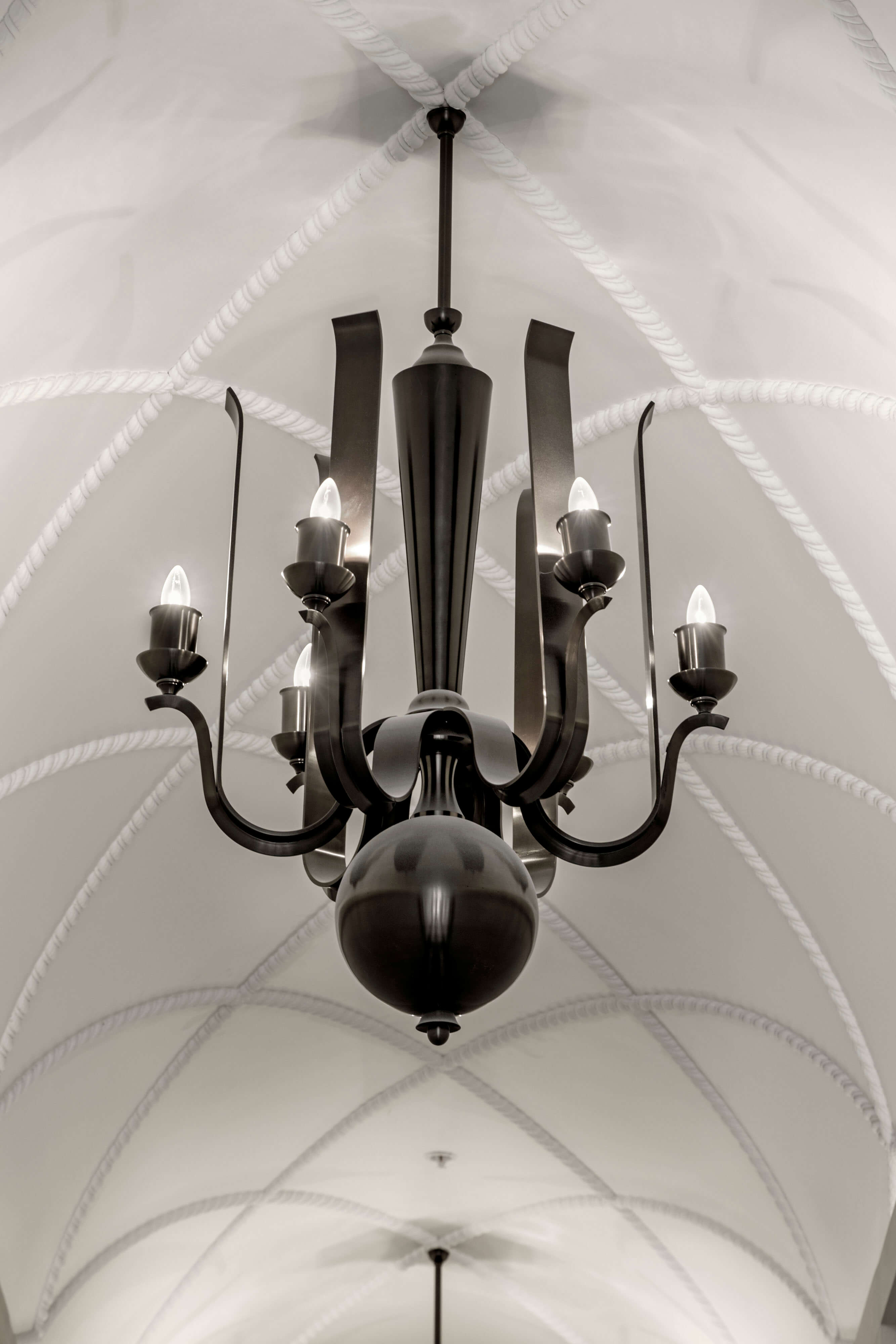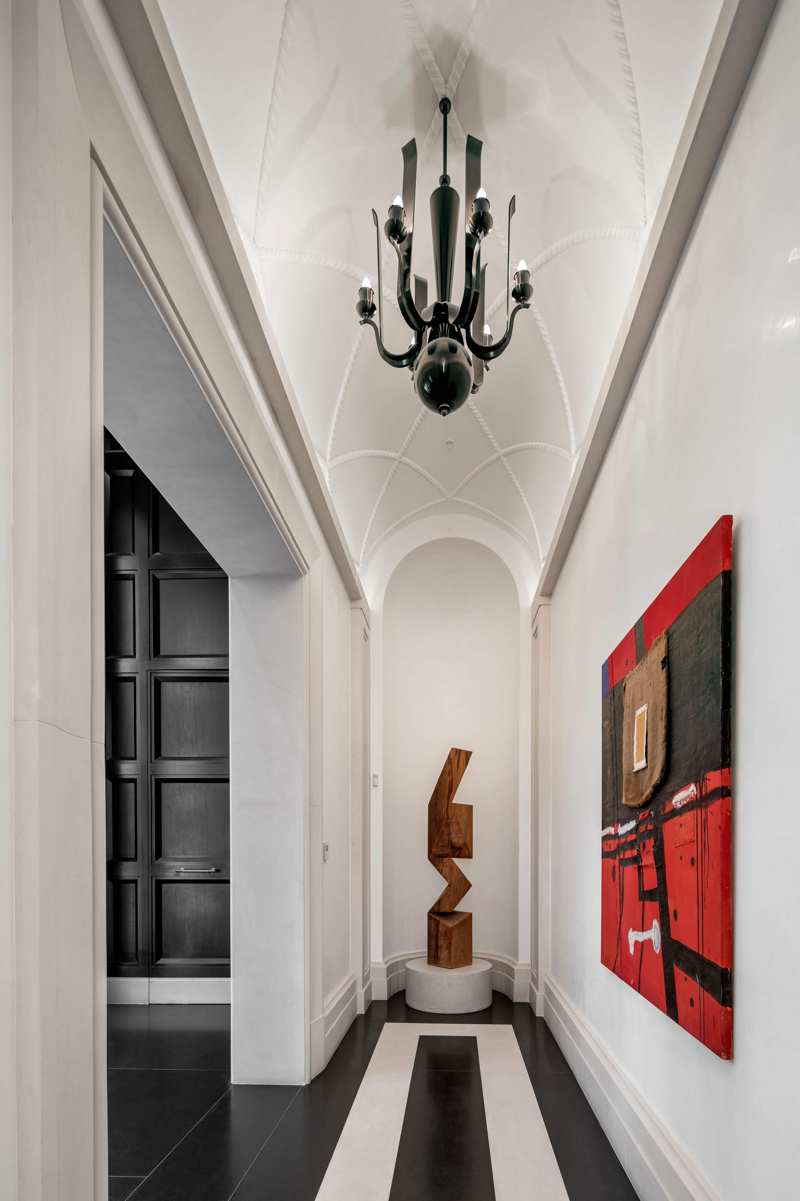 The tower is set back from the street to accommodate a semicircular motor court flanked by two patios. The entrance, carved into the facade and adorned with an updated version of Baroque door surrounds typically found in Lima’s Spanish Colonial heritage, creates a sense of enclosure and security for residents and visitors. The 18-foot-high lobby, with its bold geometric floor pattern, showcases art on simply detailed walls. Resident amenities include an indoor lap pool and lounge, each with barrel-vaulted ceilings; a paneled library; a children’s room; and a fitness center. A dramatic gallery with stucco Venetian walls and a vaulted ceiling leads to a formal garden defined by the four Directoire-style townhouses—each two stories with an attic—that weave our tower into the lower-scale urban fabric of historic San Isidro to the south.