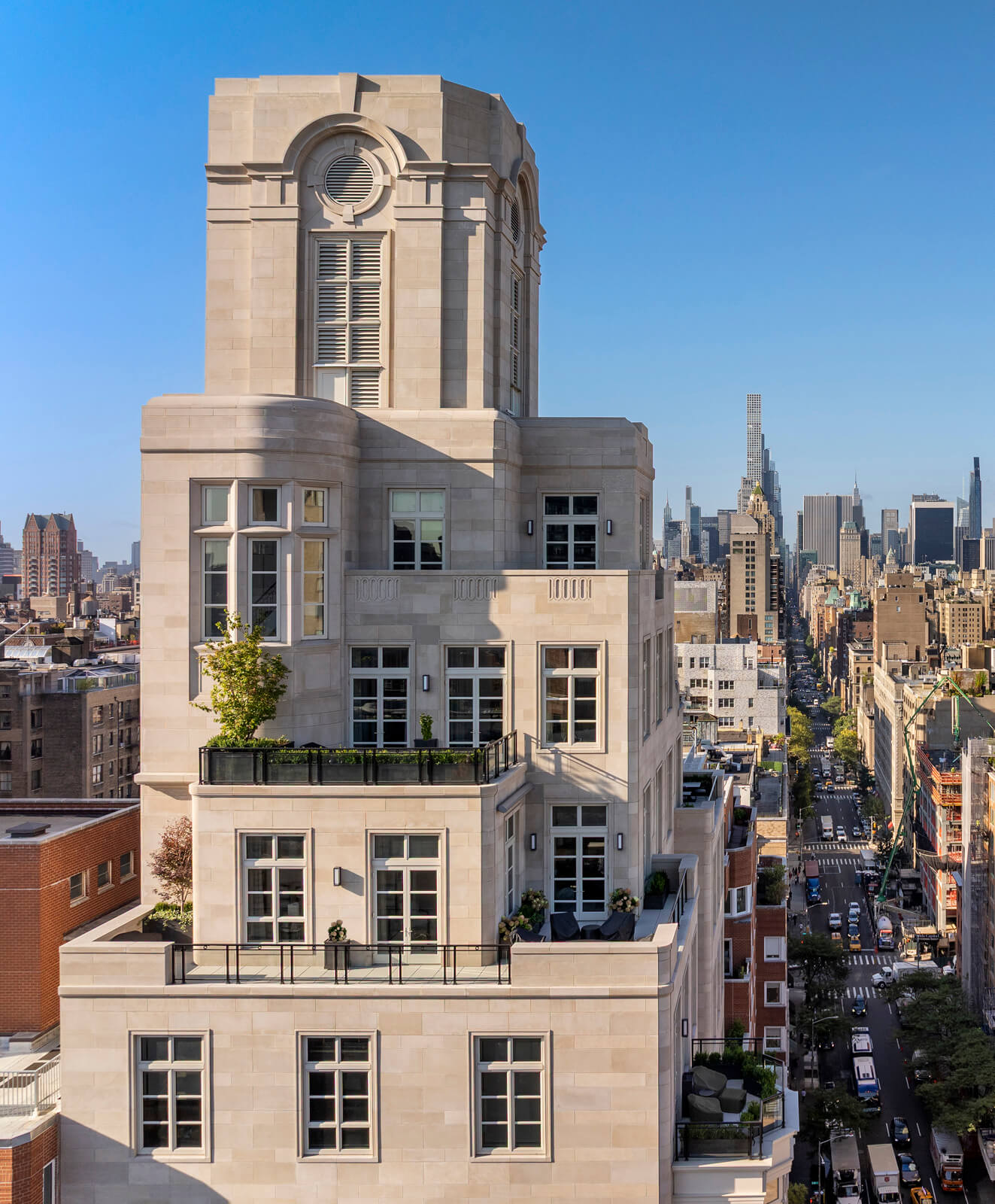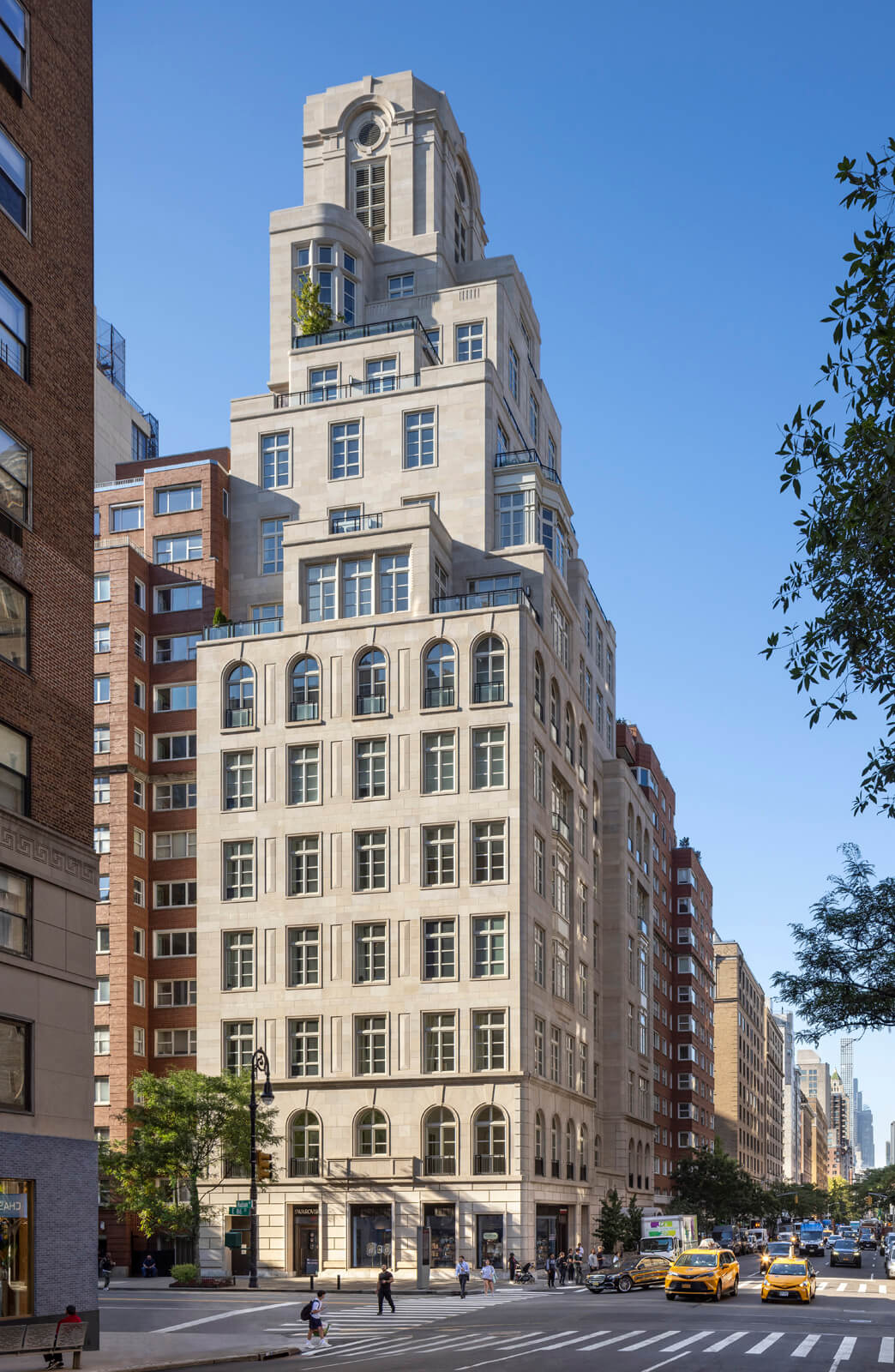 RAMSA‘s design for the Bellemont encapsulates the dimensional and stylistically eclectic qualities of Madison Avenue and is inspired primarily by the grand mansions built along 5th Avenue and Madison Avenue in the late 19th and early 20th centuries. This bolder American interpretation of traditional French architecture is evident in the Bellemont’s strong rustication, curved corners, and dramatic sculptural expression. Traditional palazzos of the same era inform some of the building’s detailing, such as rustication at the base with simpler stone patterning above, and traces of the Queen Anne architectural style appear in the strapwork, bay windows, and carved stonework around the windows. Classical French elements are apparent in the carefully planned voussoirs around the arch of the main front door and a series of arched windows that clearly mark the piano nobile as well as the frieze floor on the seventh level. Above the seventh floor, multiple penthouses on setbacks form the top half of the building. An iconic crown includes cornices, brackets, circular openings, and voussoirs characteristic of historic French architecture.