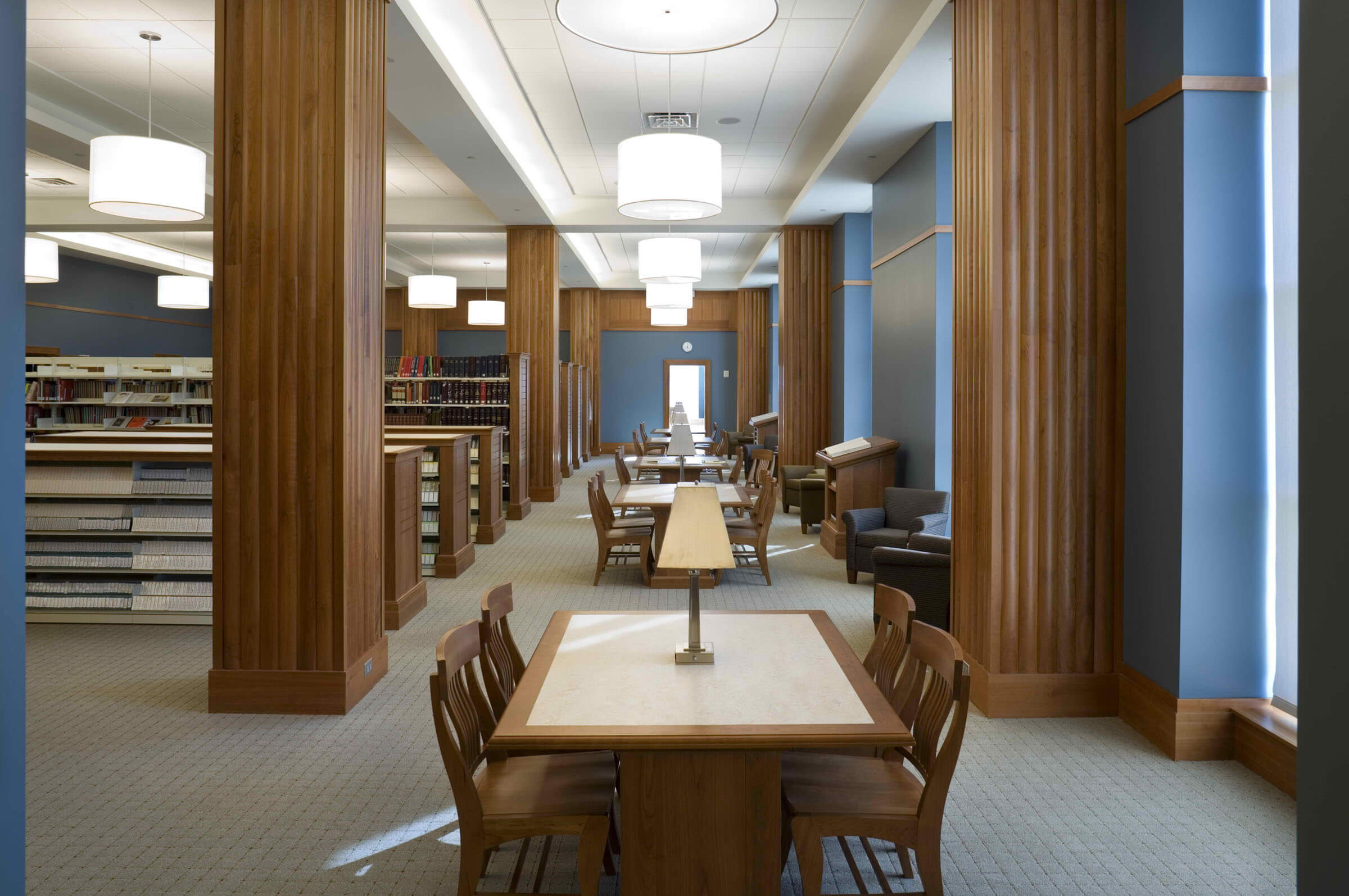 The brick and limestone front facade of the building faces north towards Macon Road with a two-story-high covered porch at the main entry. Ample parking for 339 cars is provided in front of the library building, with a convenient drop-off area and book drop. Inside the main entry there is an active lobby space with direct access to the popular materials section, the children’s library, and the conference center; and, overhead, an oculus to the rotunda space beneath the sixty-foot-diameter lantern above.