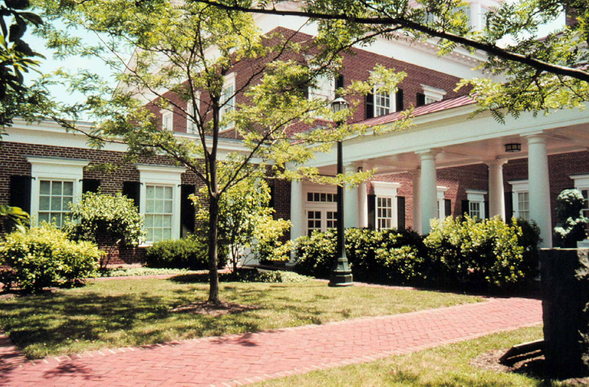 In its architectural expression, the new Darden School reflects the buildings of Thomas Jefferson, now so much the definition of Virginia's architectural persona. Sand struck Virginia red brick walls with clean detailing of white painted wood and limestone rise to red, painted metal roofs.