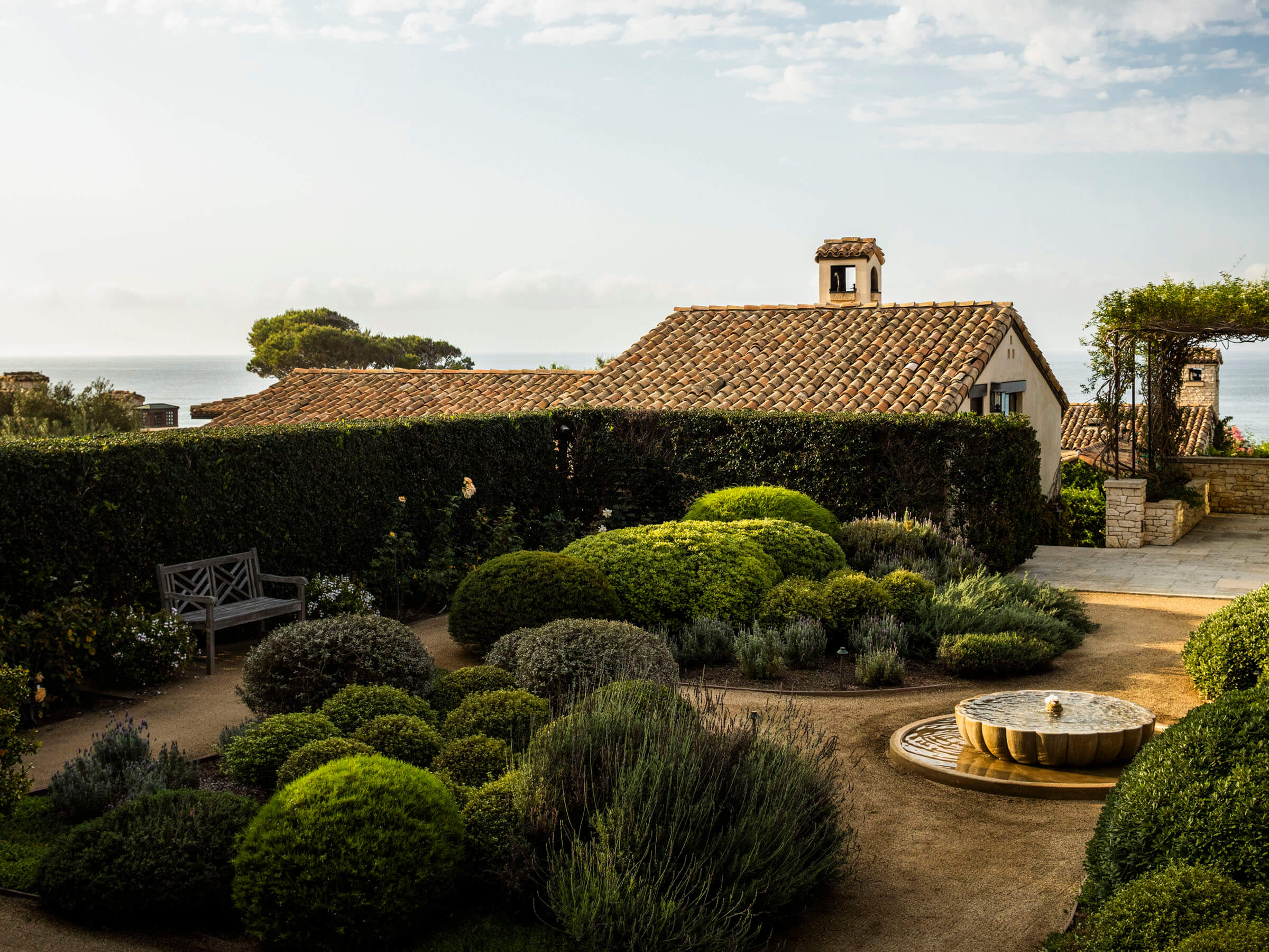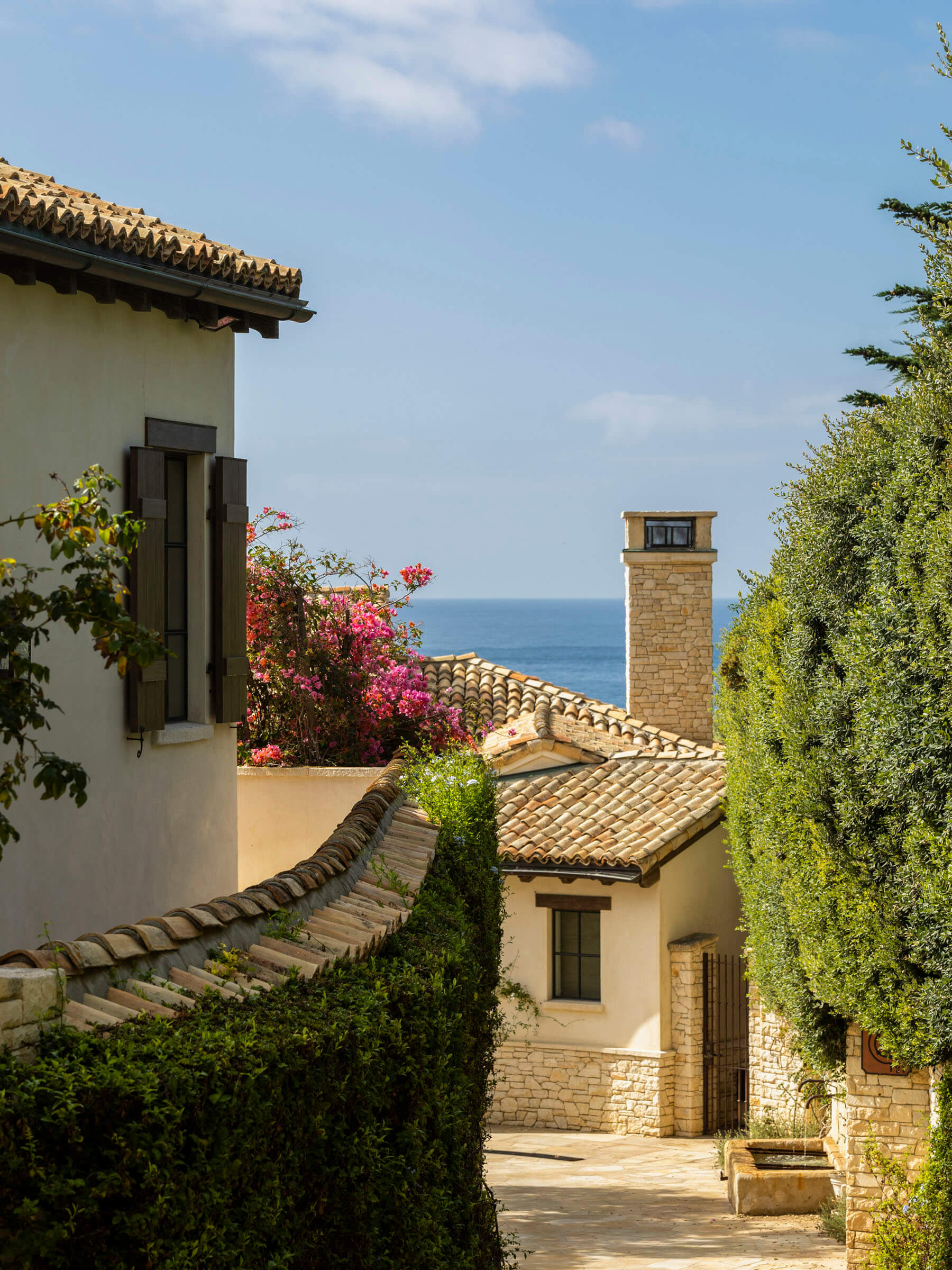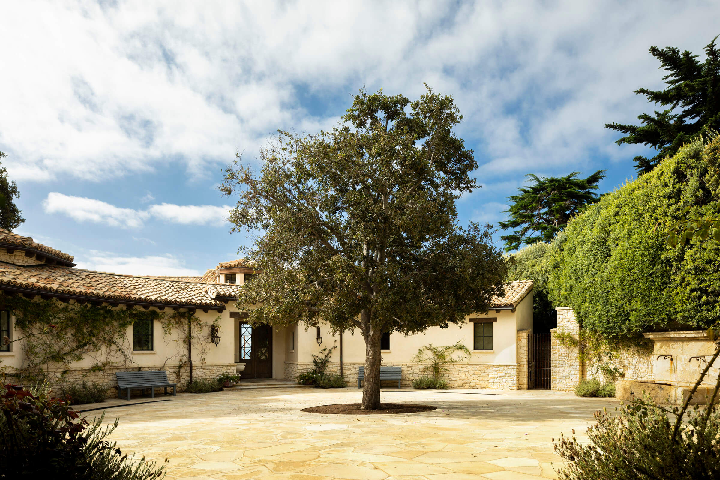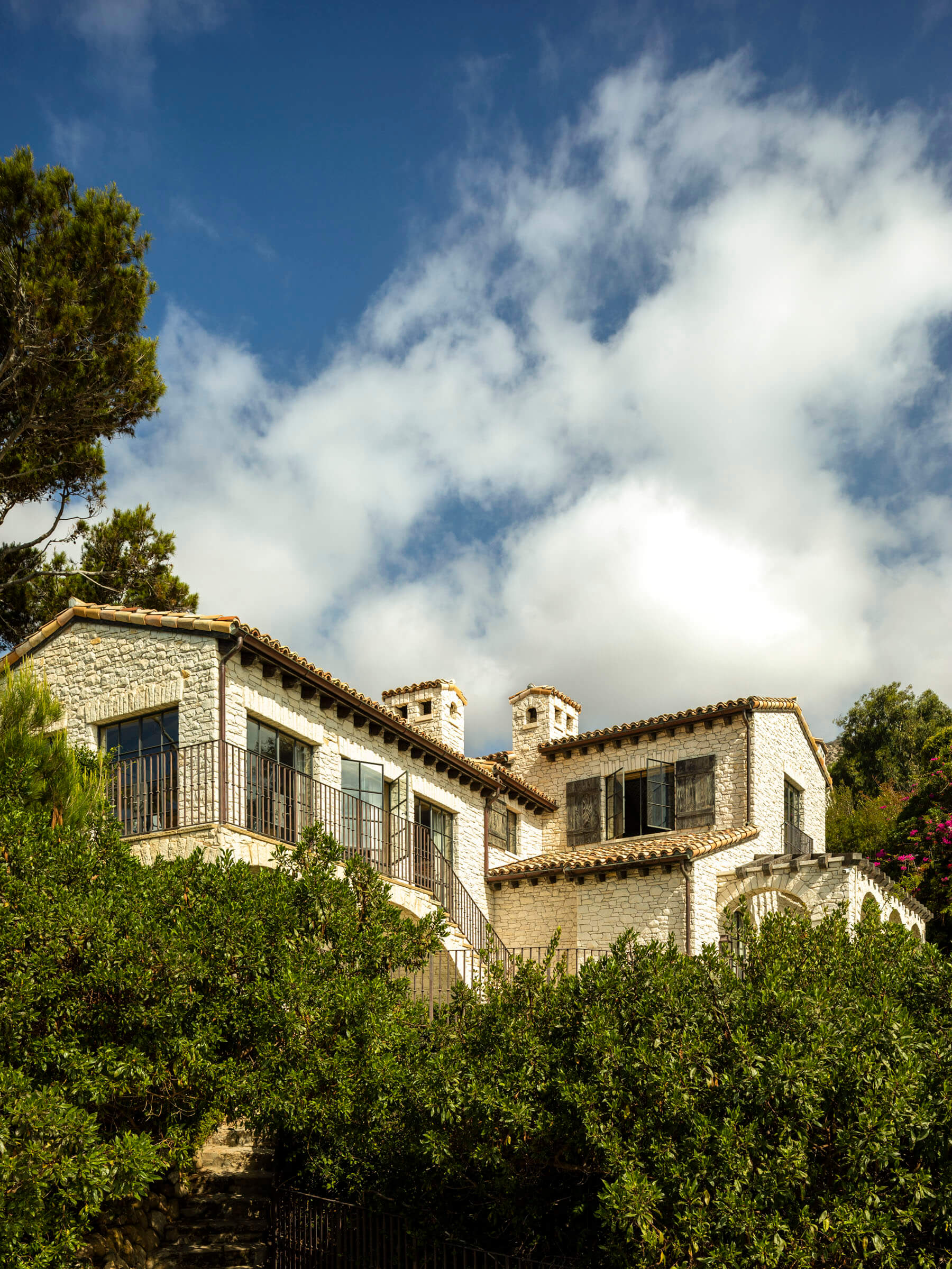 This residence, sited atop a bluff overlooking a spectacular stretch of Pacific coastline, disposes the elements of a single house into independent structures organized around garden courts in the manner of the hill towns of Provence, Tuscany, and Spain. In place of a traditional fountain square, the focus is a courtyard with an edgeless pool, anchored by a deep loggia at its north end and framed by the formal living and dining spaces to one side and the primary bedroom suite and guest accommodations on the others. Smaller courtyards and intimate gardens open from each building, interconnected by half-hidden pathways. Broad shaded terraces and outdoor staircases celebrate the steeply sloping site; their generous proportions make them gathering places in their own right. Limestone rubble walls, exposed rough timber framing, and old terra cotta roof tiles reinforce the hill-town character.
