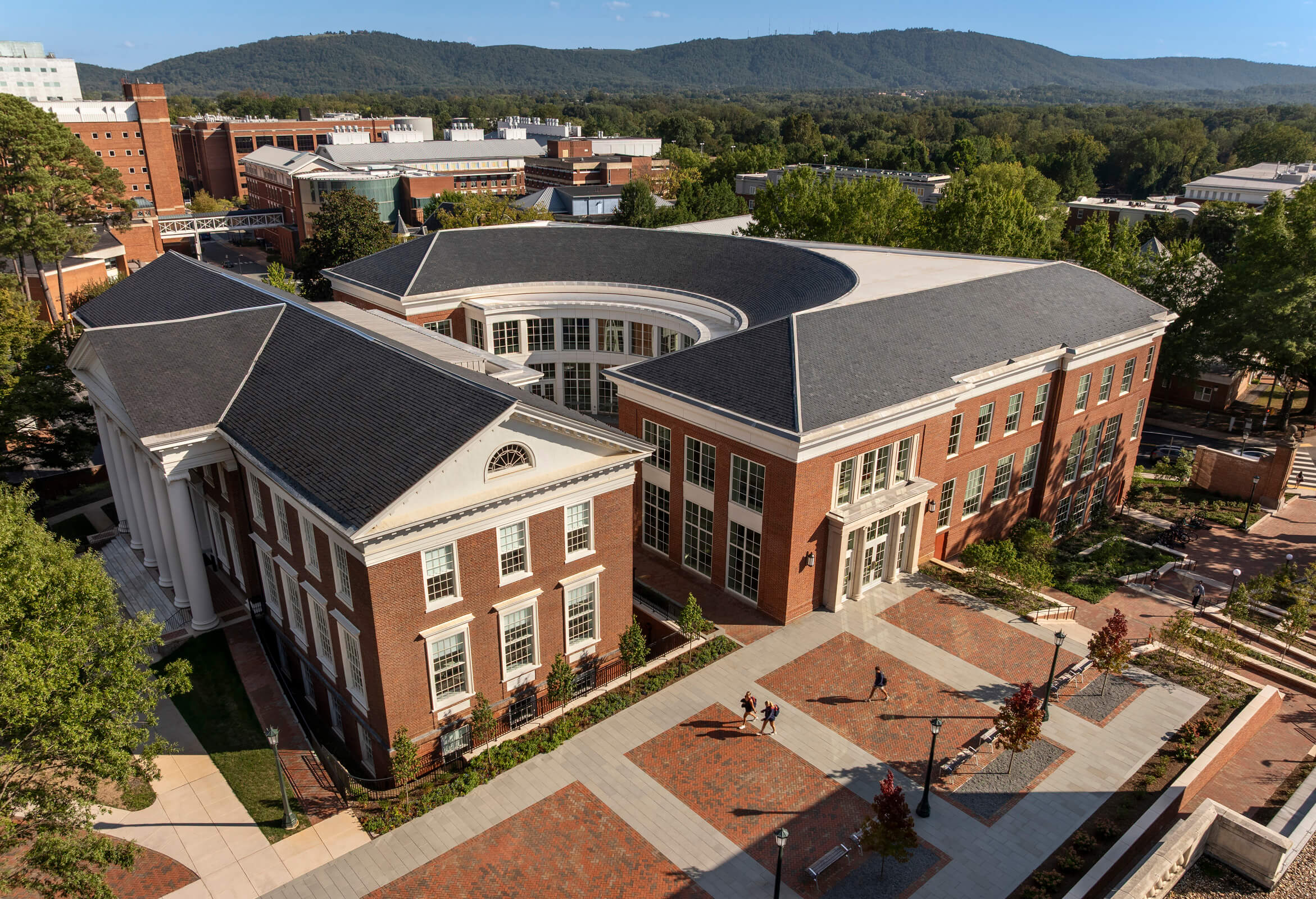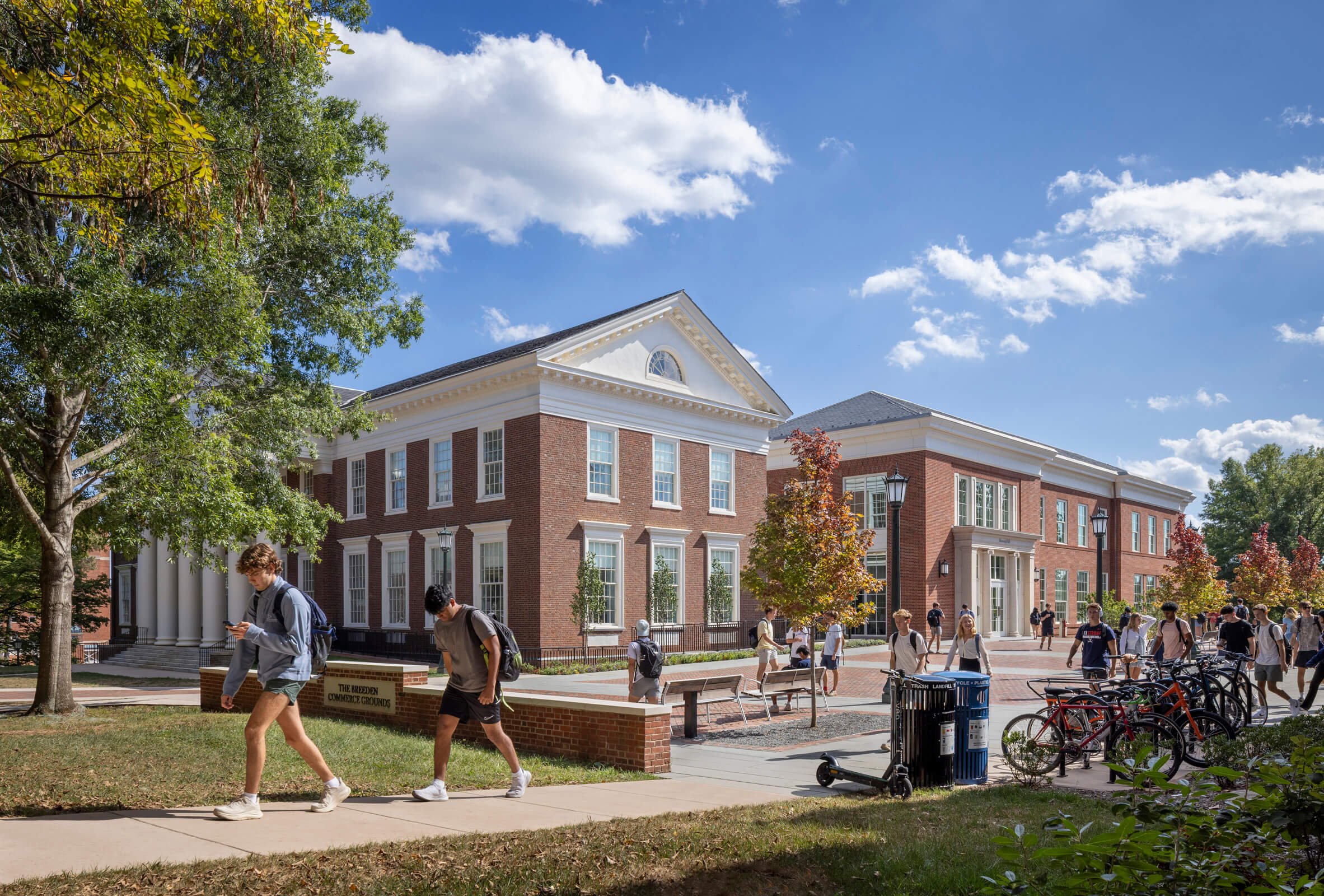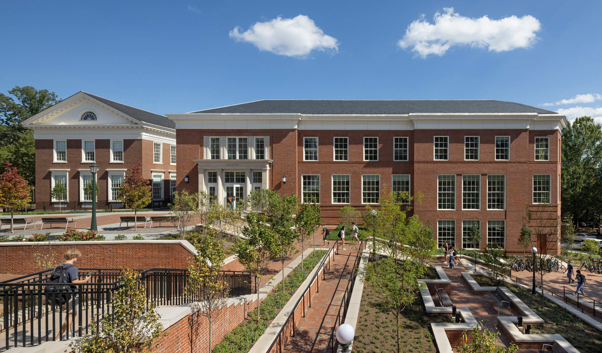 The new Shumway Hall is an addition to Cobb Hall, a 1917 classical brick building that previously held UVA’s Chemistry Department and was later part of the Medical School. The expansion utilizes the 35-foot-plus grade change to bring prominence to the addition while visually separating it from Cobb Hall. The adjacent Ruppel Drive has been transformed from a heavily trafficked access road into an accessible pedestrian walkway lined with terraces and gardens by connecting service areas between the buildings underground—the pathway links Cobb and Shumway Halls with the existing Rouss & Robertson Halls to the west, creating a new precinct for the McIntire School of Commerce.