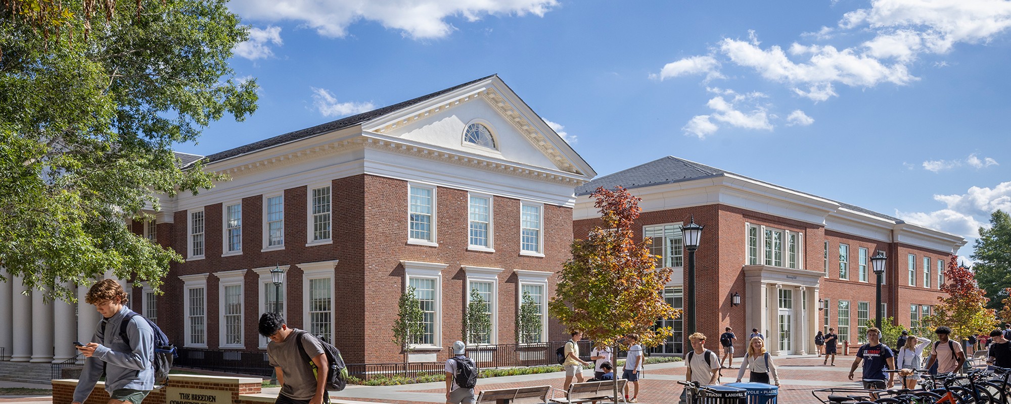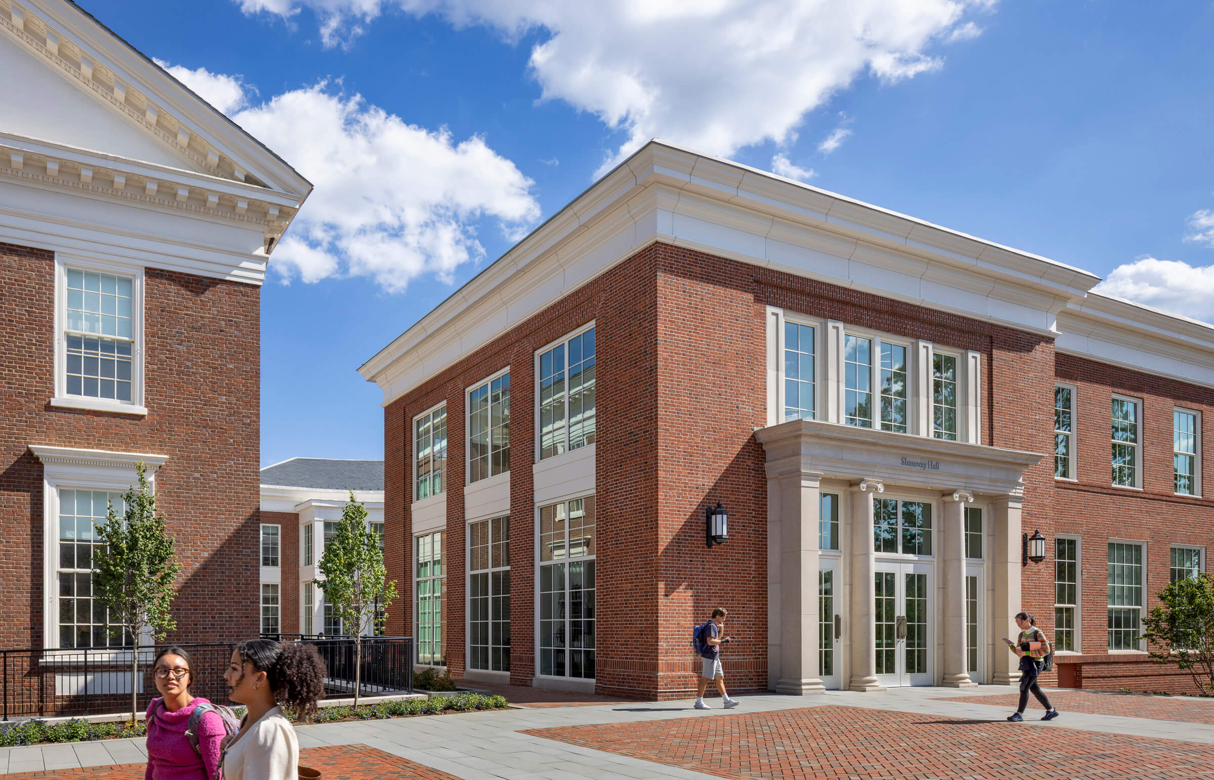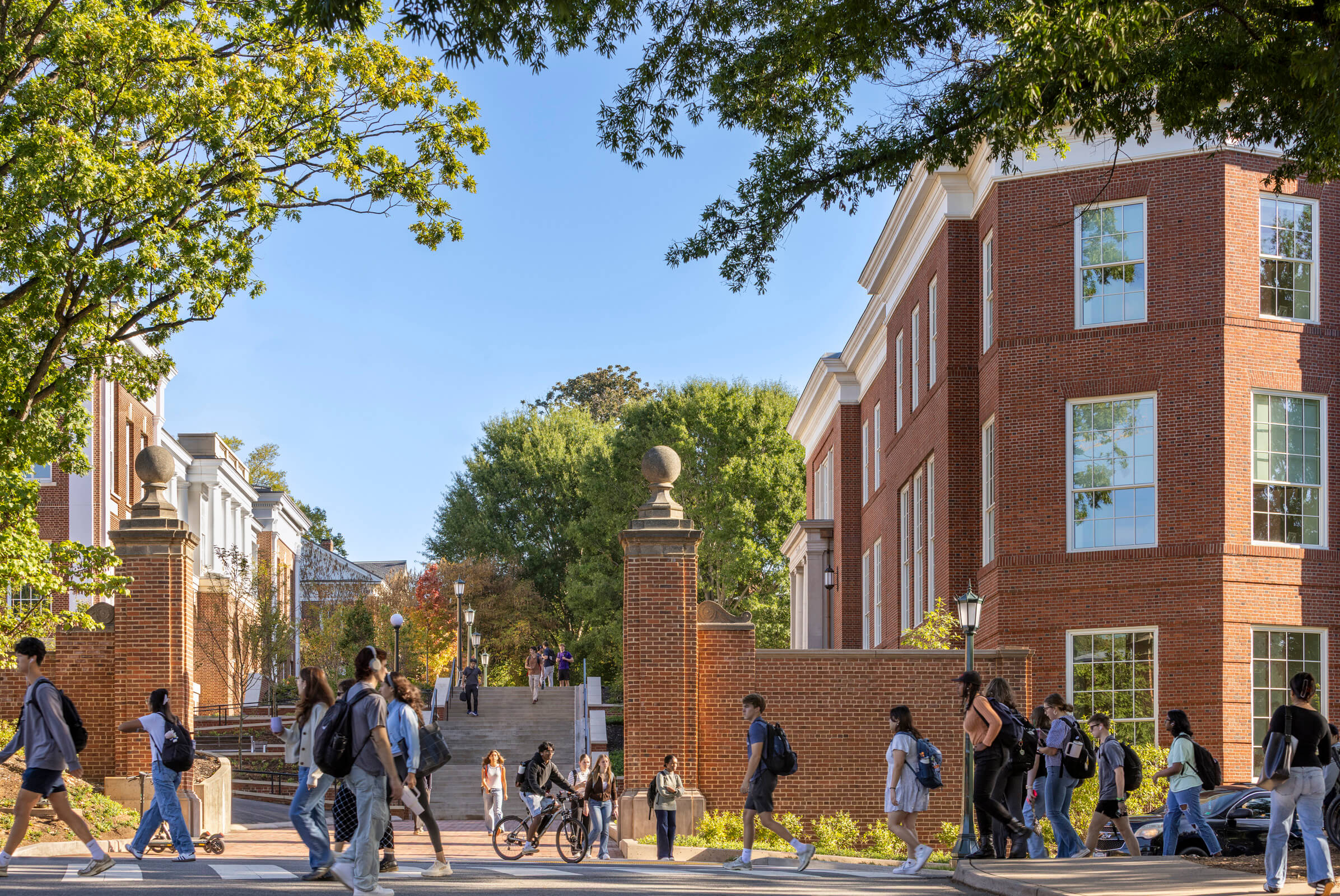 The new Shumway Hall is an addition to Cobb Hall, a 1917 classical brick building that previously held UVA’s Chemistry Department and was later part of the Medical School. The expansion utilizes the 35-foot-plus grade change to bring prominence to the addition while visually separating it from Cobb Hall. The adjacent Ruppel Drive has been transformed from a heavily trafficked access road into an accessible pedestrian walkway lined with terraces and gardens by connecting service areas between the buildings underground—the pathway links Cobb and Shumway Halls with the existing Rouss & Robertson Halls to the west, creating a new precinct for the McIntire School of Commerce.