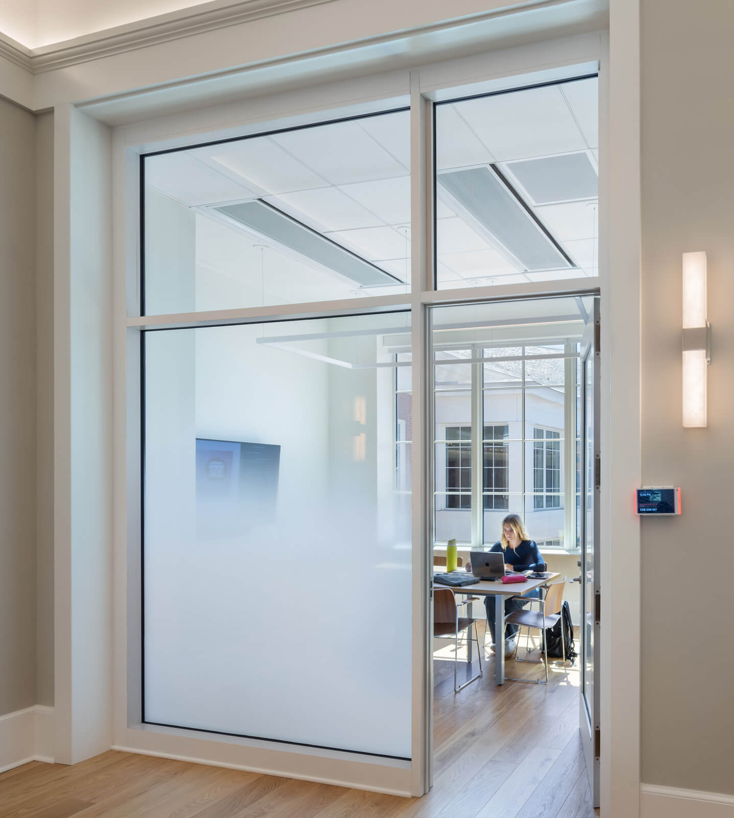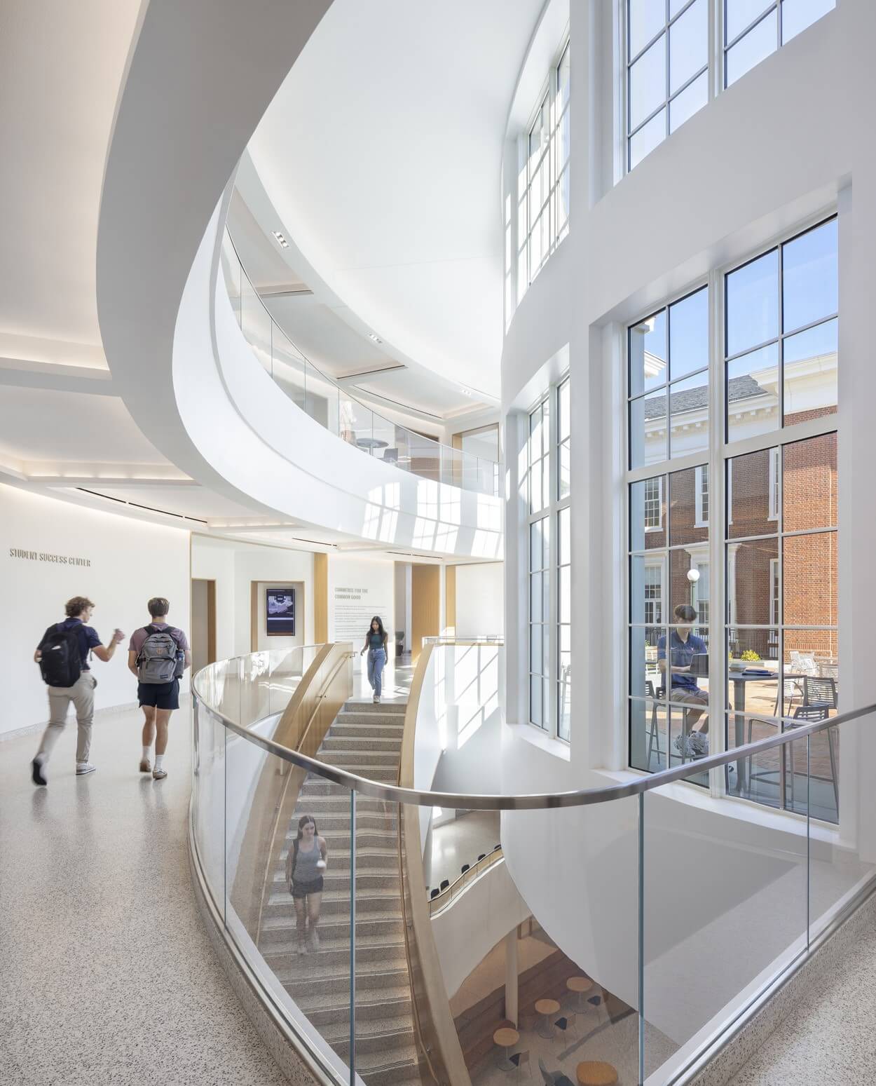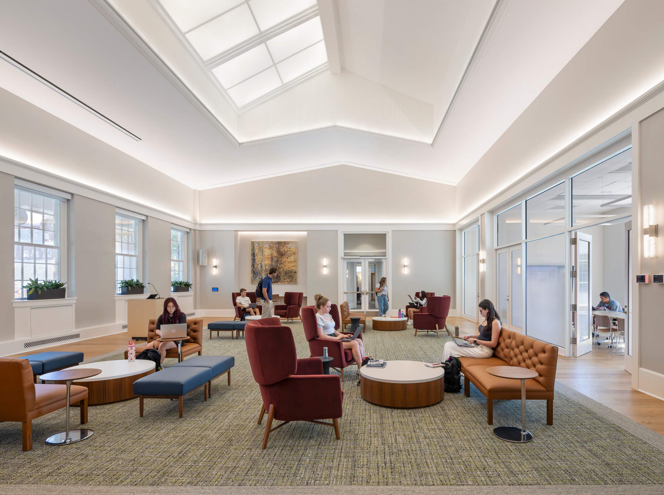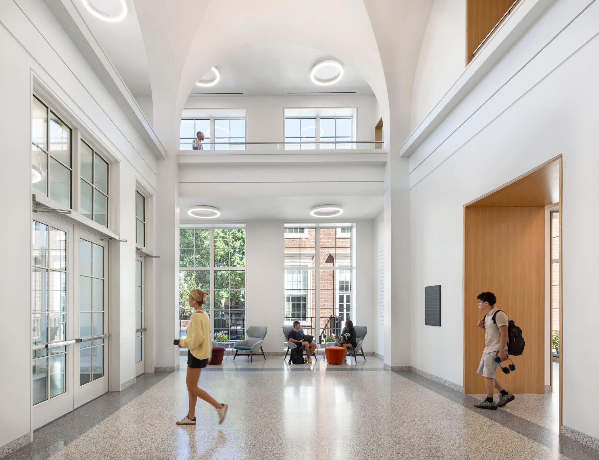 UVA’s McIntire School expansion is a case study in bridging academic vision, evolving pedagogy, and historic preservation. In consultation with the Virginia Department of Historic Resources, the historically significant front portion of Cobb Hall was rehabilitated, while inside, the building was made ADA compliant, and large classrooms which had been subdivided over time into small workspace were recaptured. A skylight on the top floor which had been covered has been reinterpreted as a laylight and now crowns the double-height Solarium.
