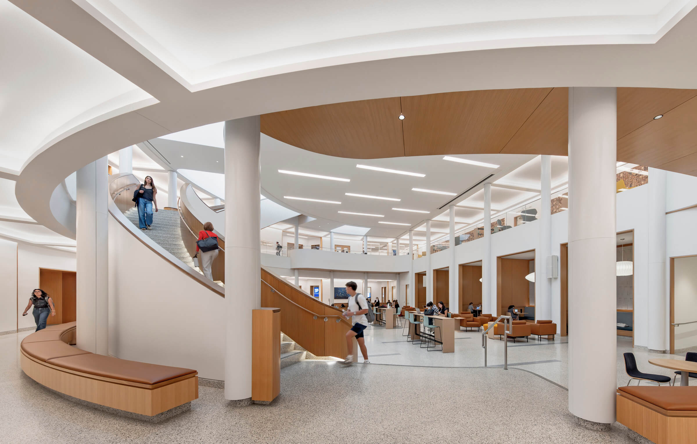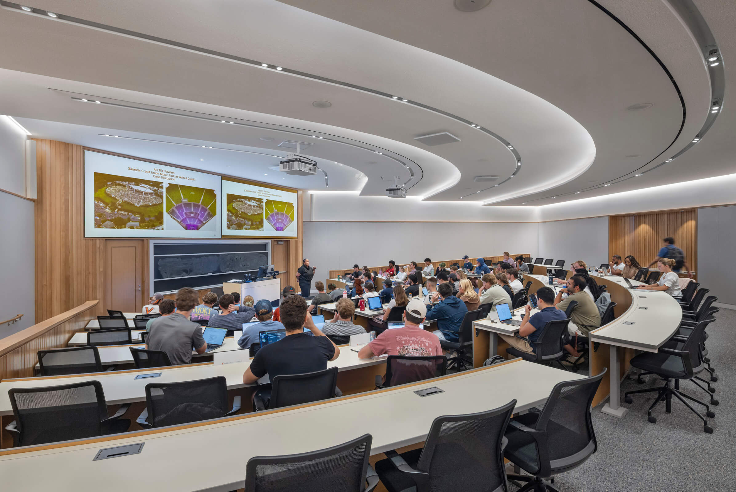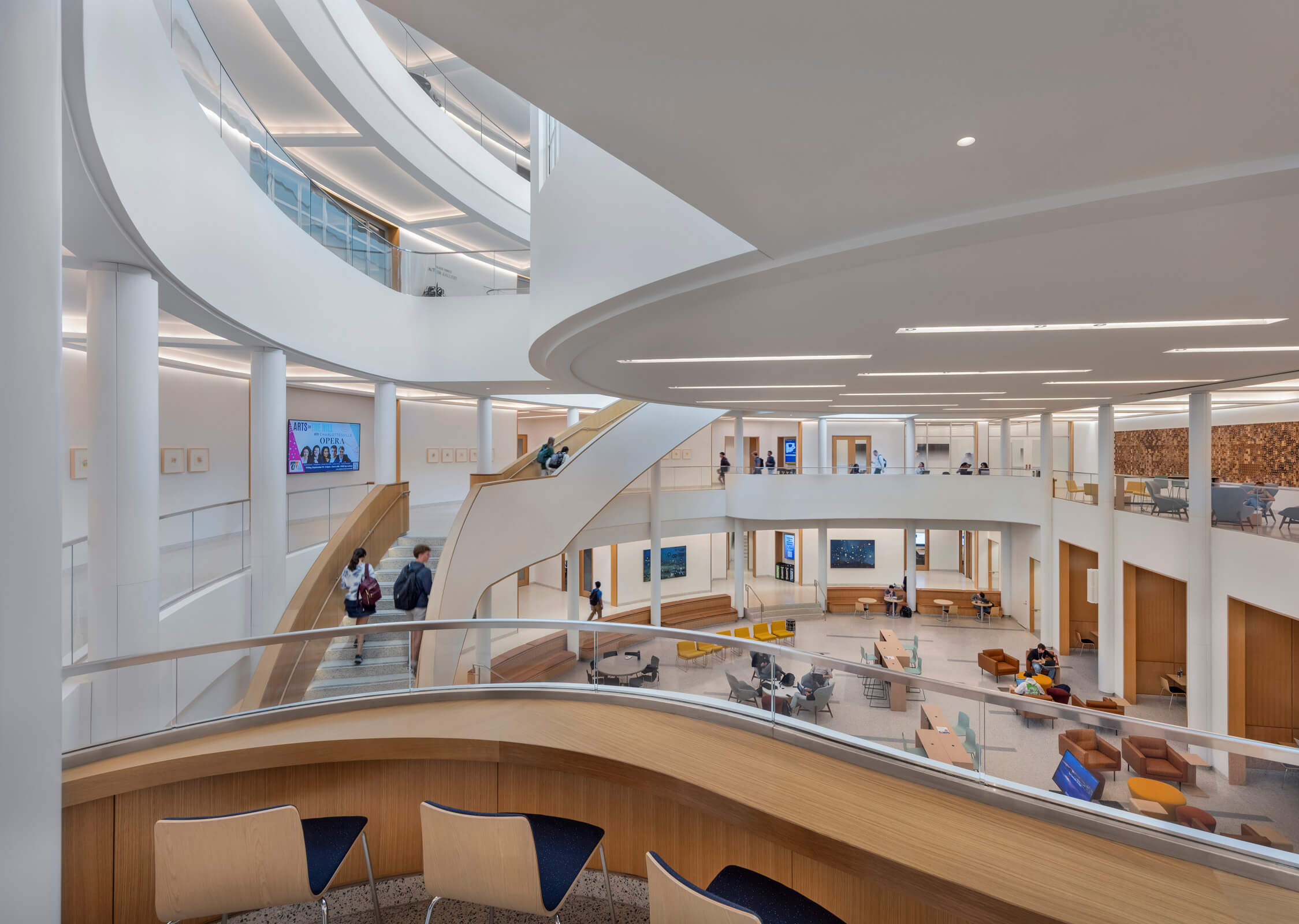New state-of-the-art learning spaces within Shumway Hall support the McIntire School’s innovation and data sciences programs and foster student interaction, including a two-story atrium; the Student Success Center, which centralizes student services; a café; commons overlooking Jefferson Park Avenue; gallery spaces; data and innovation labs; and a flat-floor Grand Classroom with flexible seating and a partition that allows the room to be divided into separate classrooms, as well as a 200-seat event space.
