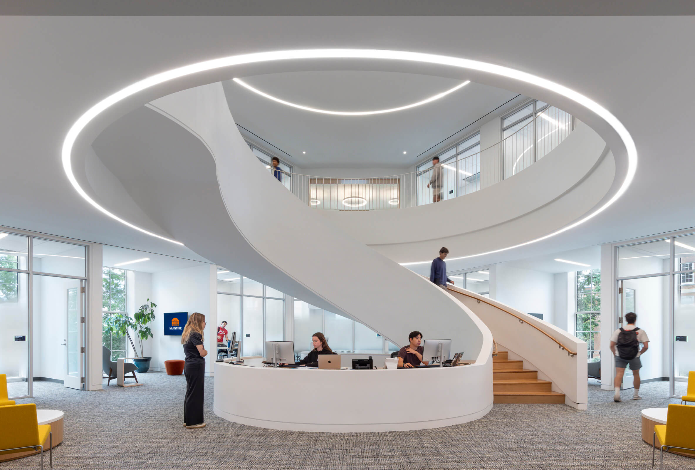 McIntire reimagined its facilities over the course of a decade to support the future of business education with technology-rich environments responsive to AI and digital transformation. The opening of the new facility marks a transformative moment and enables the school to expand enrollment while preserving its close-knit, collaborative culture. The project is targeting LEED Silver certification.