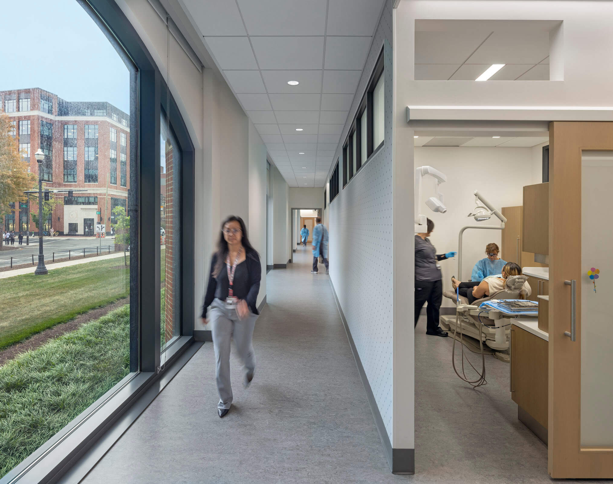 Students will enter the new building from the west courtyard through a double-height commons on the first floor, where a café and lounge will serve as a hub of social activity. The first floor will also accommodate technique and simulation labs, a 5,700-square-foot flat-floor classroom, the renovated dean's suite, and admissions offices. On the second floor, exam rooms and outpatient surgery suites serve an on-site dental practice run by the school's faculty, with a separate at-grade entrance for the public directly accessible from Neil Avenue, taking advantage of the slope of the site. On the third and fourth floors, dental students treat patients under faculty supervision.