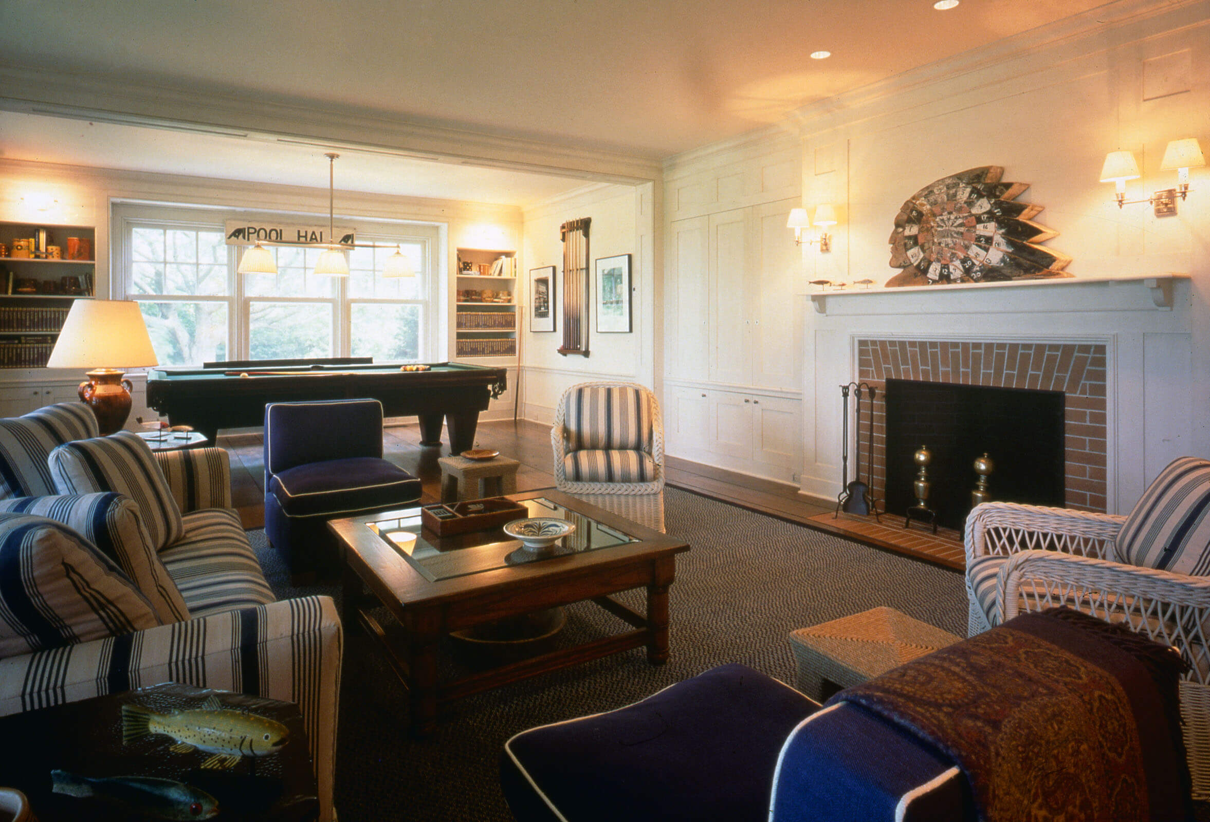 The primary rooms are contained within a rectangular gambrel-roofed mass bracketed by identically sized, shed-roofed library and kitchen wings. To the north, the wing containing the family room and garage appears to be an earlier saltbox-type house to which the grander, symmetrical house was later added. Rough, thickly cut cedar shakes and bold classical moldings enliven the simple forms of the house, in contrast with the taut, machine-cut shingles and planar trim of the more picturesque forms of the Shingle Style. Large and small scale are vividly contrasted: giant order pilasters bracket the central entry facade and support a deep-bracketed eave; slender, paired colonettes support the entry porch. Inside, the large rooms open onto one another, demonstrating the kind of country-house planning perfected at the beginning of this century, although the interior details again derive from earlier American prototypes.