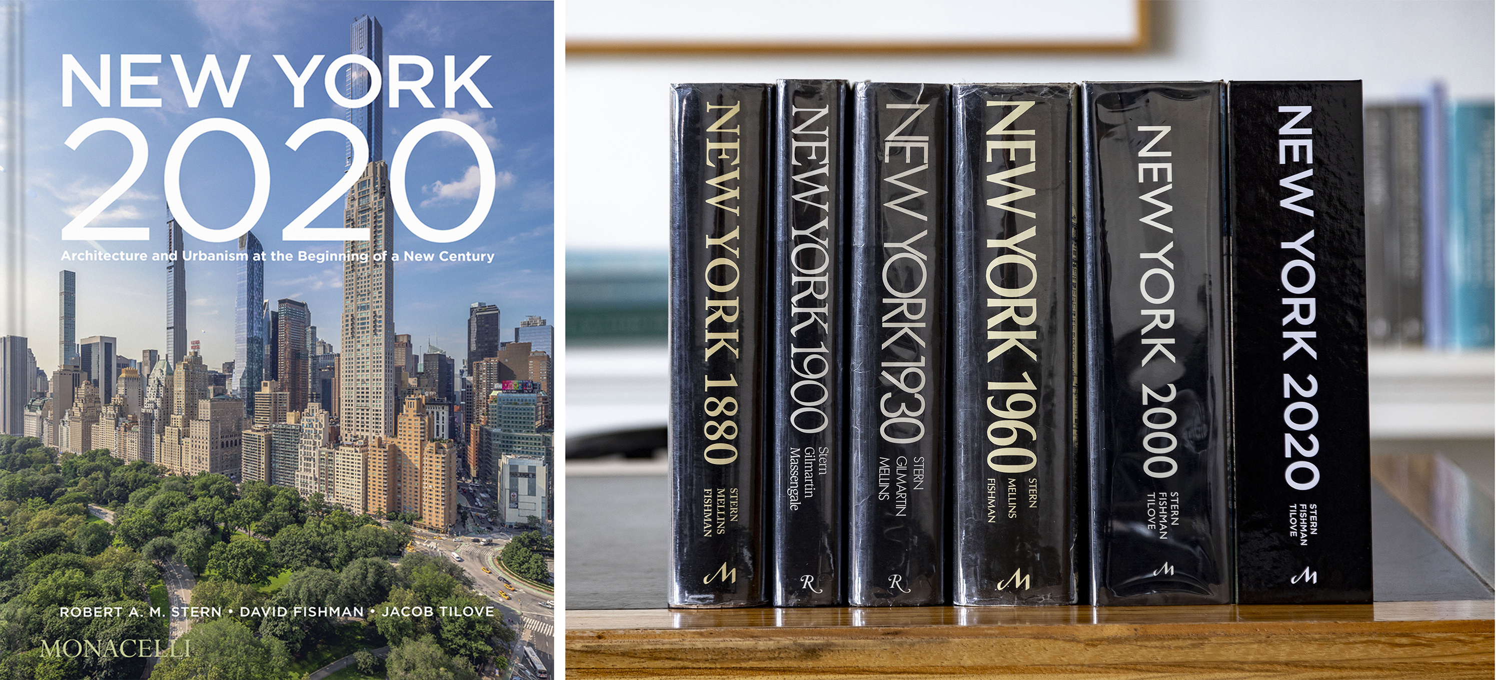 Left: New York 2020 (Monacelli, 2025). Right: the complete New York book series—New York 1880 (Monacelli, 1999), New York 1900 (Rizzoli, 1992), New York 1930 (Rizzoli, 1987), New York 1960 (Monacelli, 1997), New York 2000 (Monacelli, 2006), and New York 2020.