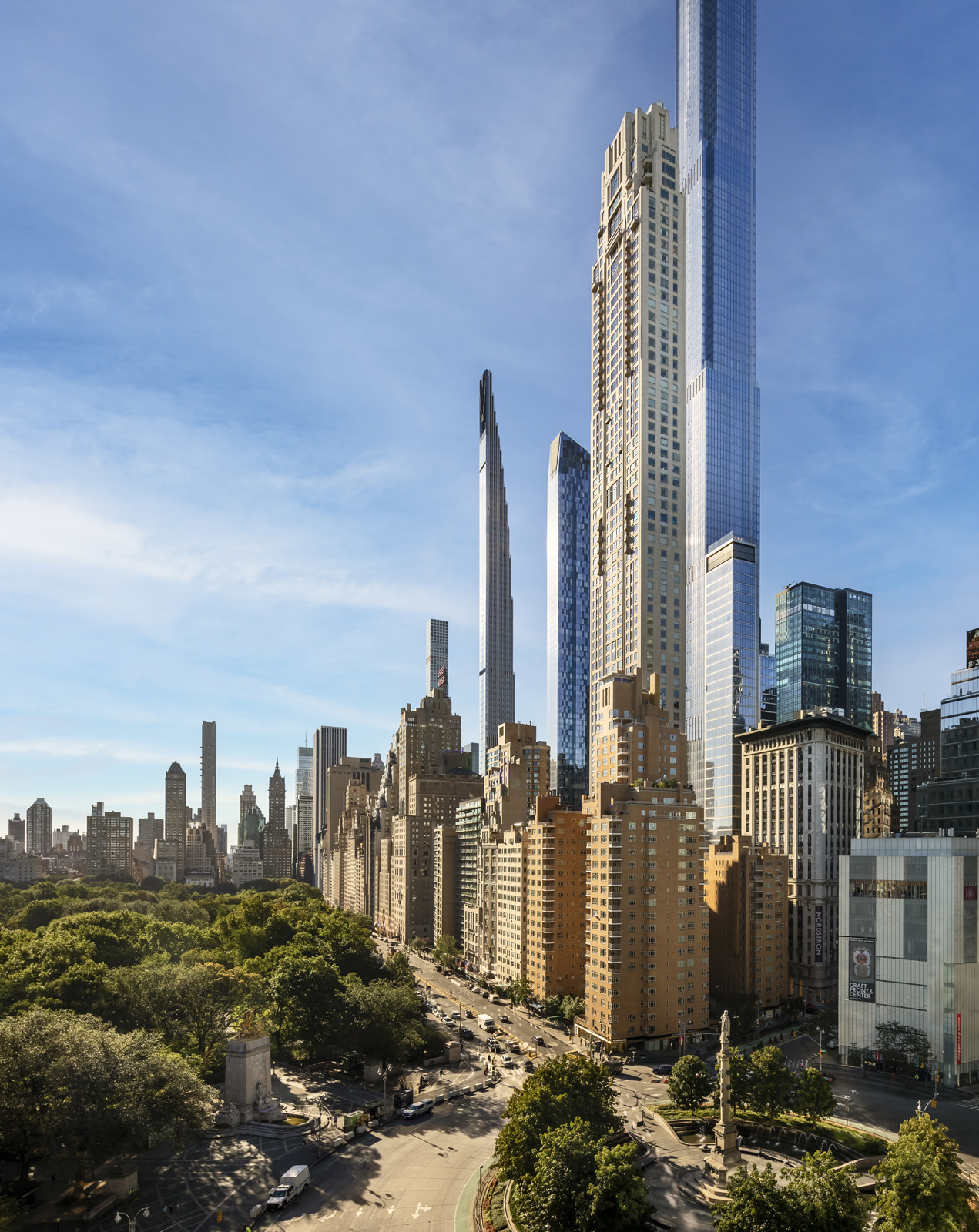 View looking southeast from Columbus Circle of the tall and supertall towers along Central Park South. Photograph: Francis Dzikowski.
